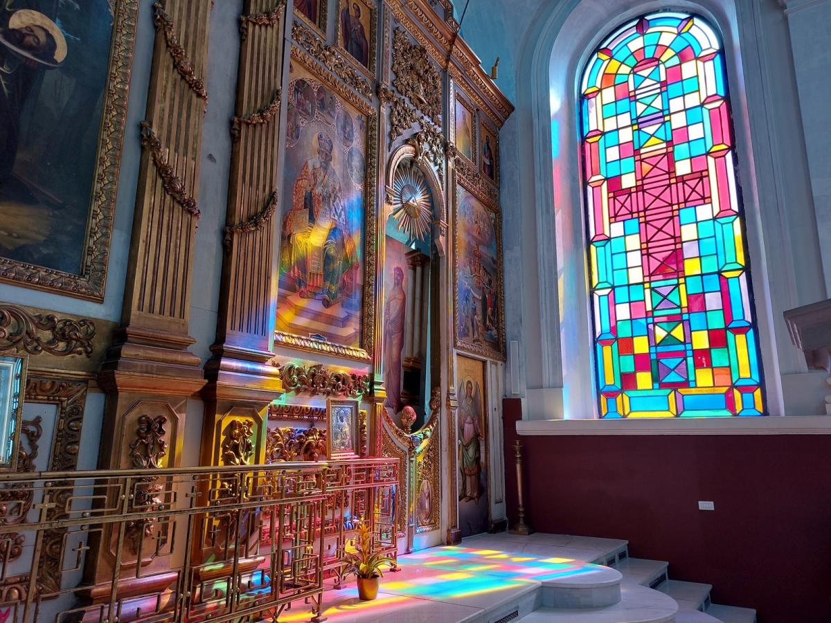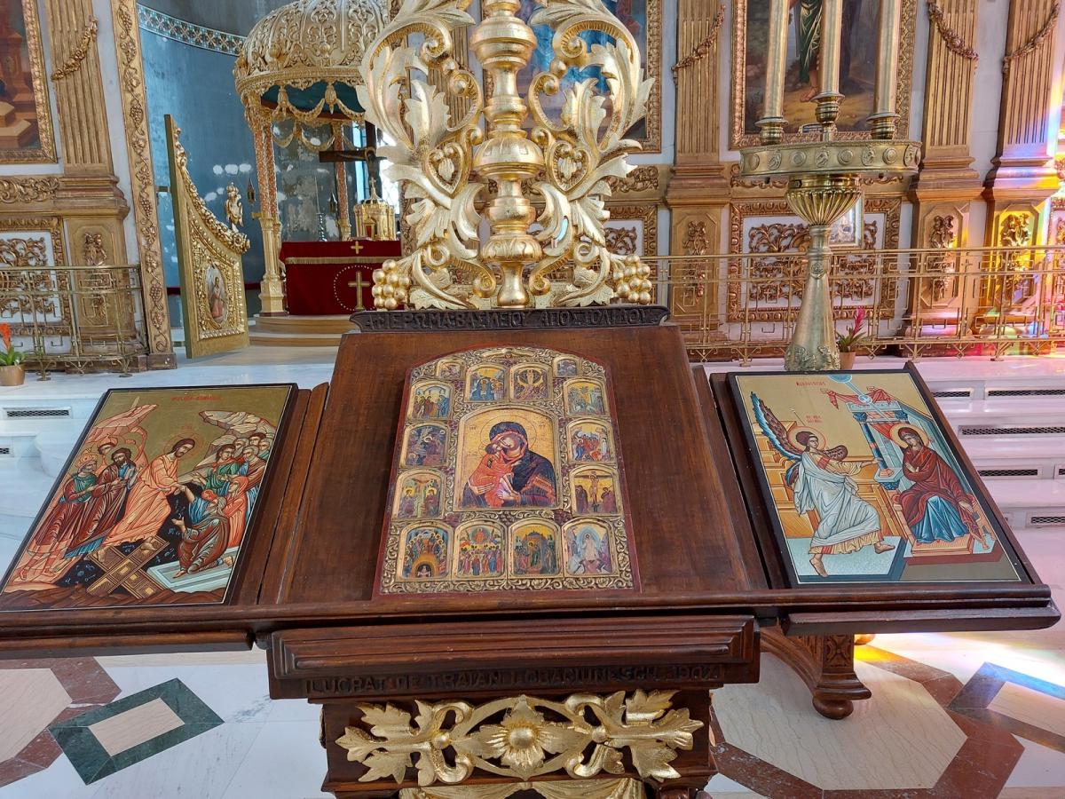 Interiorul bisericii părea, la vizita IPS un mic „colț de rai”: soarele primăvăratec străbătea, în chip tainic, vitraliile multicolore, iar lumina poposea pe chipurile sfinților de la Catapeteasma placată cu aur. Era ceva cu adevărat dumnezeiesc în acel joc de lumini care transforma candelabrele din cristal de Murano și de Boemia în boabe de rouă cu slipiri de diamant.