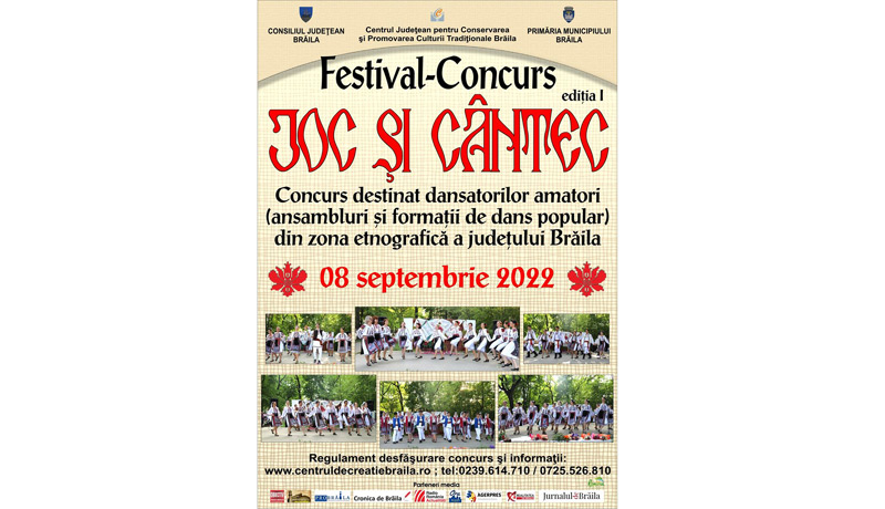 Astfel, Centrul Județean pentru Conservarea și Promovarea Culturii Tradiționale (Centrul de Creație), împreună cu Consiliul Județean și Primăria Municipiului Brăila, organizează, în ziua de 8 septembrie a.c., Festivalul-concurs "Joc și cântec", ediția I, destinat dansatorilor amatori (ansamblurilor și formațiilor de dansuri populare) din zona etnografică a județului Brăila.