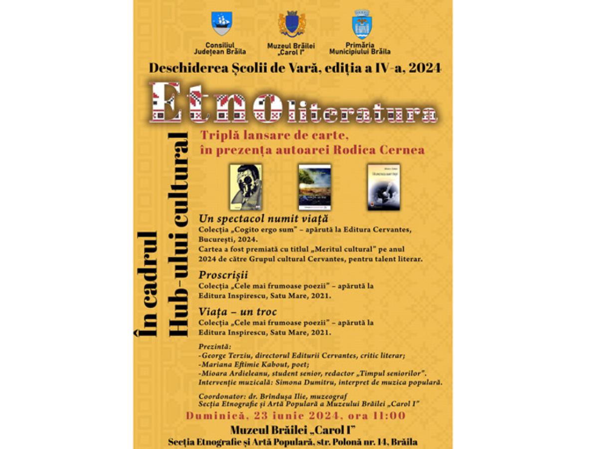 Deschiderea oficială a Școlii de Vară 2024 are loc duminică, 23 iunie, ora 11.00, la Secția Etnografie și Artă Populară (Strada Polonă nr. 14) cu o triplă lansare de carte, în prezența autoarei Rodica Cernea, activitate în cadrul Hub-ului cultural „Etnoliteratura”. Se vor lansa cărțile: