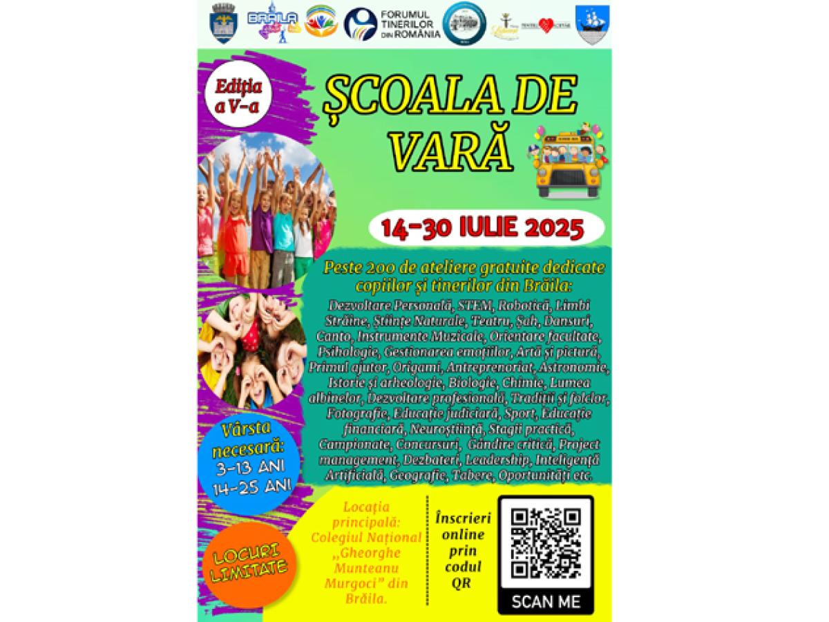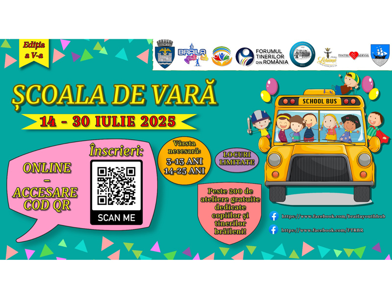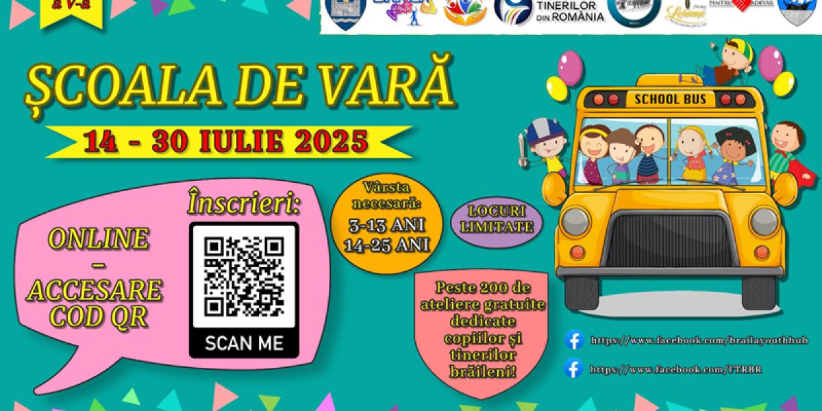 Vara aceasta, Școala de Vară revine la Brăila într-o formulă și mai dinamică, cu un program bogat în activități educative, recreative și inspiraționale, adresate copiilor și tinerilor cu vârste cuprinse între 3 și 25 de ani. Aflat la a cincea ediție, evenimentul este organizat de Centrul de Tineret – Brăila Youth Hub și Forumul Tinerilor din România – Brăila, consolidându-se deja ca una dintre cele mai importante inițiative de educație nonformală din județ.