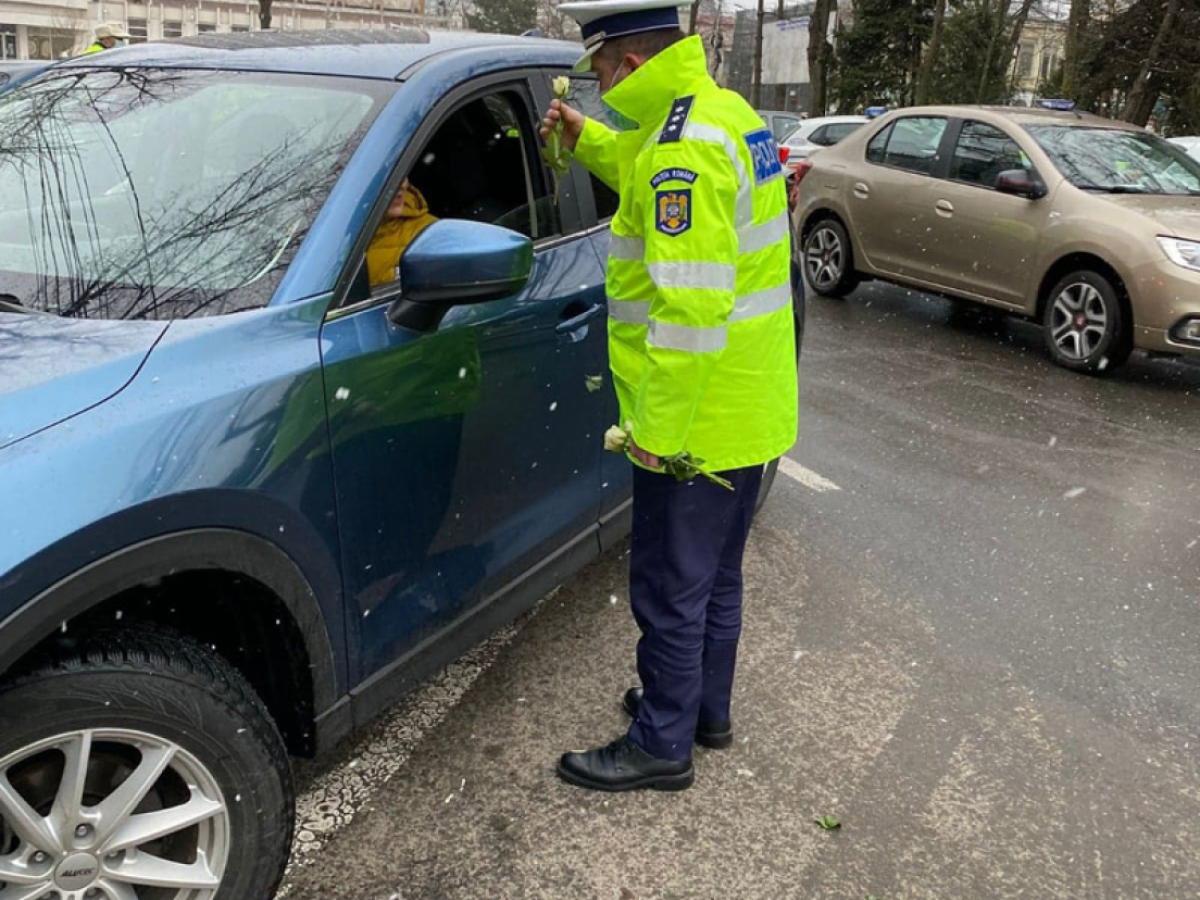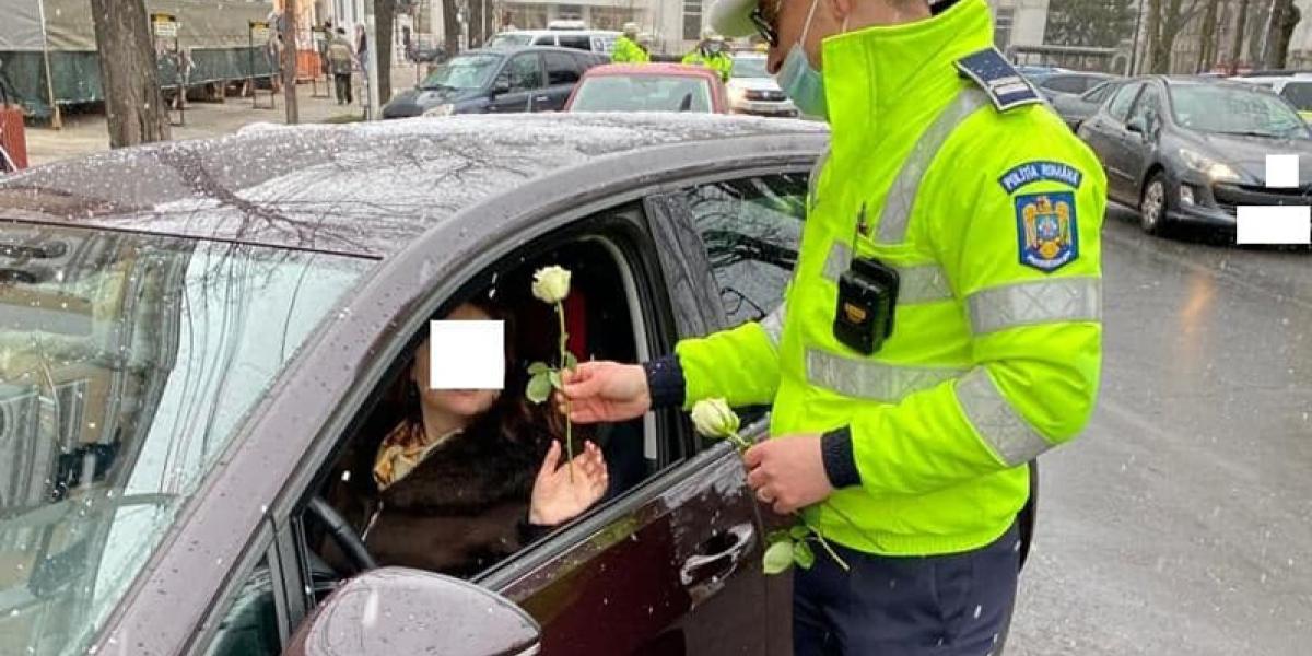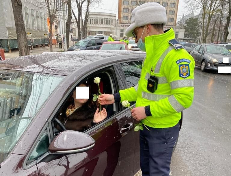* ieri dimineață, polițiști din cadrul Serviciului Rutier le-au întâmpinat pe doamne și domnișoare cu flori și mărțișoare * este deja o tradiție ca, în fiecare an, polițiștii să ofere o mică bucurie femeilor aflate la volan, dar și sfaturi menite să le ferească de accidente * anul acesta, o mică bucurie a fost adusă și doamnelor și domnișoarelor din Ucraina care tranzitau municipiul Brăila