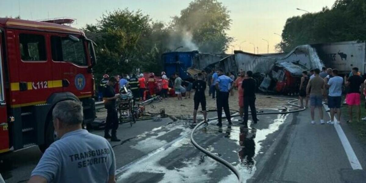 * duminică seară, pe DN 2A, în apropierea stației de taxare de la Giurgeni, județul Ialomița, două TIR-uri încărcate cu cereale au luat foc, după ce s-au ciocnit * potrivit unor surse, șoferii sunt brăileni, din localitatea Victoria, aceștia fiind duși inconștienți la spital, după ce au fost preluați din autocamioanele cuprinse de flăcări * unul dintre șoferii de TIR a murit în urma leziunilor grave suferite