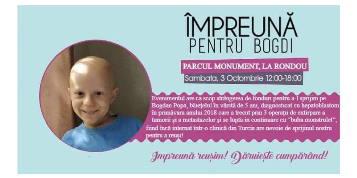 Brăilenii se unesc din nou pentru Bogdi, băieţelul care de doi ani se luptă cu buba-monstruleţ (hepatoblastom)! Sâmbătă, 3 octombrie, în Parcul Monument, sunteţi invitaţi la Târgul caritabil “Împreună pentru Bogdi”, un eveniment la care veţi găsi foarte multe produse, dar din care nu lipsesc momentele artistice.