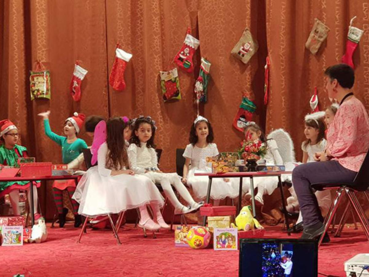 Costumaţi în spiriduşi, zâne şi reni, cei mici l-au ajutat pe Moş Crăciun să pregătească multe dintre cadourile ce vor fi oferite copiilor în Ajun. Bineînţeles că pentru efortul depus au fost răsplătiţi din plin. Alături de zâmbăreţii clasei pregătitoare A au fost şi actorii Ioana Zărnescu şi Daniel Mecu de la Teatrul de Păpuşi “Cărăbuş”.