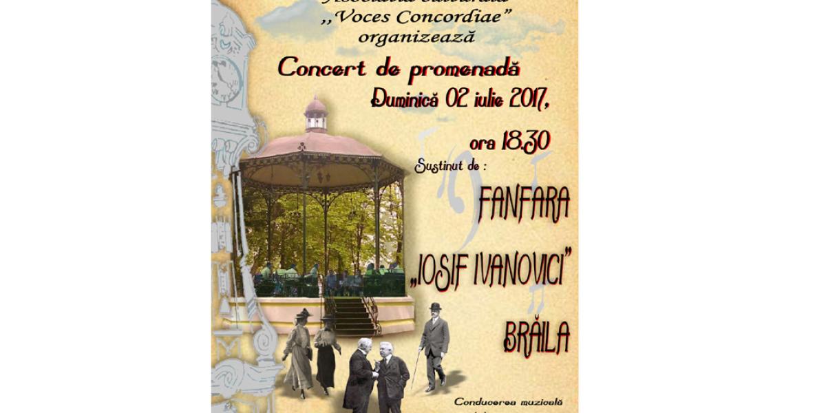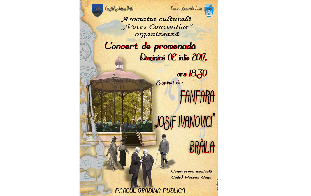“În parc fanfara cânta. Seri muzicale camerale “, acesta este titlul proiectului propus de Asociaţia Culturală “Voces Concordiae” – Brăila şi finanţat de către Consiliul Judeţen Brăila din fondurile alocate prin “Programul pentru finanţare nerambursabilă a activităţilor nonprofit de interes judeţean-cultură, sport pentru anul 2017”.