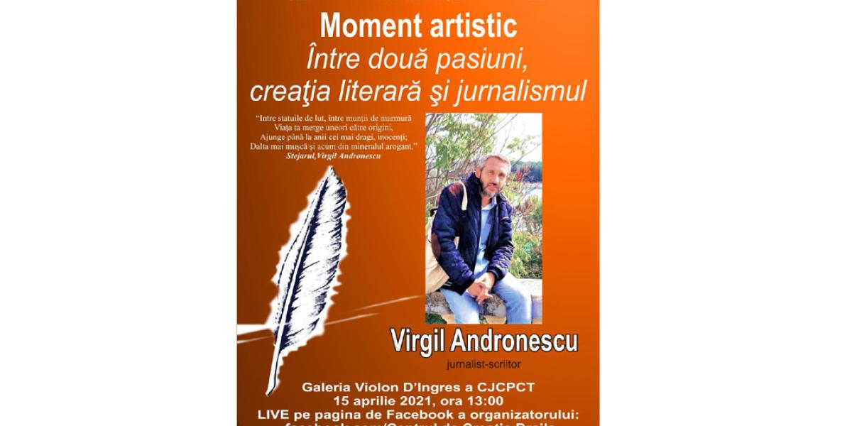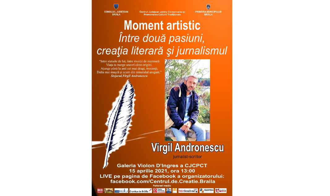 Consiliul Județean Brăila, cu sprijinul Primăriei Municipiului Brăila și Centrului Județean pentru Conservarea și Promovarea Culturii Tradiționale Brăila, vă invită astăzi să fiți spectatori la un moment artistic special, cu un invitat special. Este vorba despre evenimentul “Între două pasiuni, creația literară și jurnalismul”, iar invitatul este Virgil Andronescu, jurnalist si scriitor.