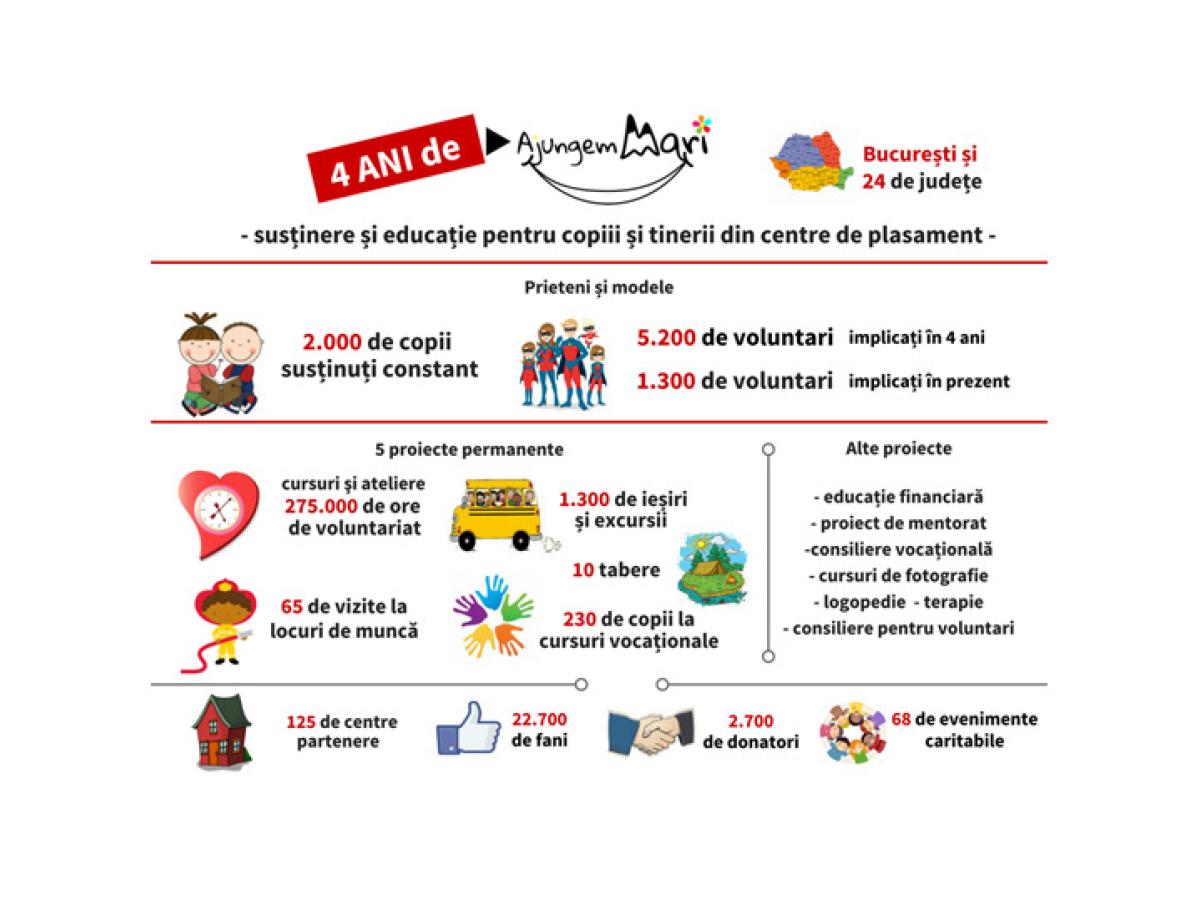 Prin programul “Ajungem MARI” voluntarii dăruiesc trei ore pe săptămâna pentru a deveni prieteni, profesori şi modele pentru copiii şi tinerii din centre sociale şi de plasament. În ţară sunt în prezent peste 19.000 de copii instituţionalizaţi, iar numărul personalului şi voluntarilor e insuficient.