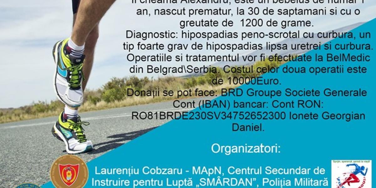 “Viaţa l-a aruncat într-o luptă teribilă, din care nu are voie să iasă decât victorios, iar pentru asta are nevoie de ajutorul nostru! Aşadar, indiferent de vârstă, condiţie fizică ori performanţe sportive, vă invităm la un cros umanitar, maxim 10 ture (10 km), în jurul Orăşelul Copiilor. Este distanţa care îi poate aduce micului nostru erou Alexandru şansa la o nouă viaţă. Este momentul să-i motivăm pe princhindeii noştri şi să îi răsplătim, învăţându-i totodată că săvârşirea unei fapte bune nu ţine cont de vârstă. Mulţumim pe această cale sponsorilor noştri, care au ales să ne fie alături şi în această campanie. Ne înclinăm în faţa bunăvoinţei lor! De la mic la mare, dragi prieteni, alergători de performanţă, amatori, iubitoare mămici, iubitori tătici, scumpi bunici, voi, puternici elevi şi studenţi, stimate doamne, domnişoare şi stimaţi domni, sunteţi aşteptaţi în Parcul Monument, să fim alături de Alexandru!”, este mesajul celor doi organizatori.