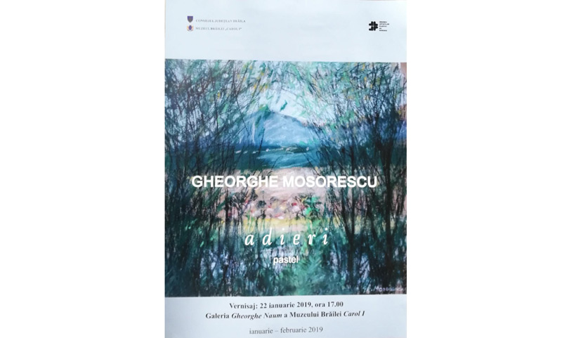 Scenograf al Teatrului Dramatic “Maria Filotti” Brăila din 1982, Gheorghe Mosorescu alege în zi aniversară, la împlinirea vârstei de 65 de ani şi 25 de ani ca preşedinte al Filialei Brăila a Uniunii Artiştilor Plastici din România A.P.R, să vină în faţa iubitorilor de artă cu ADIERI în pastel, lucrări ce vor prilejuri o călătorie artistică a perioadei 1997 – 2018.