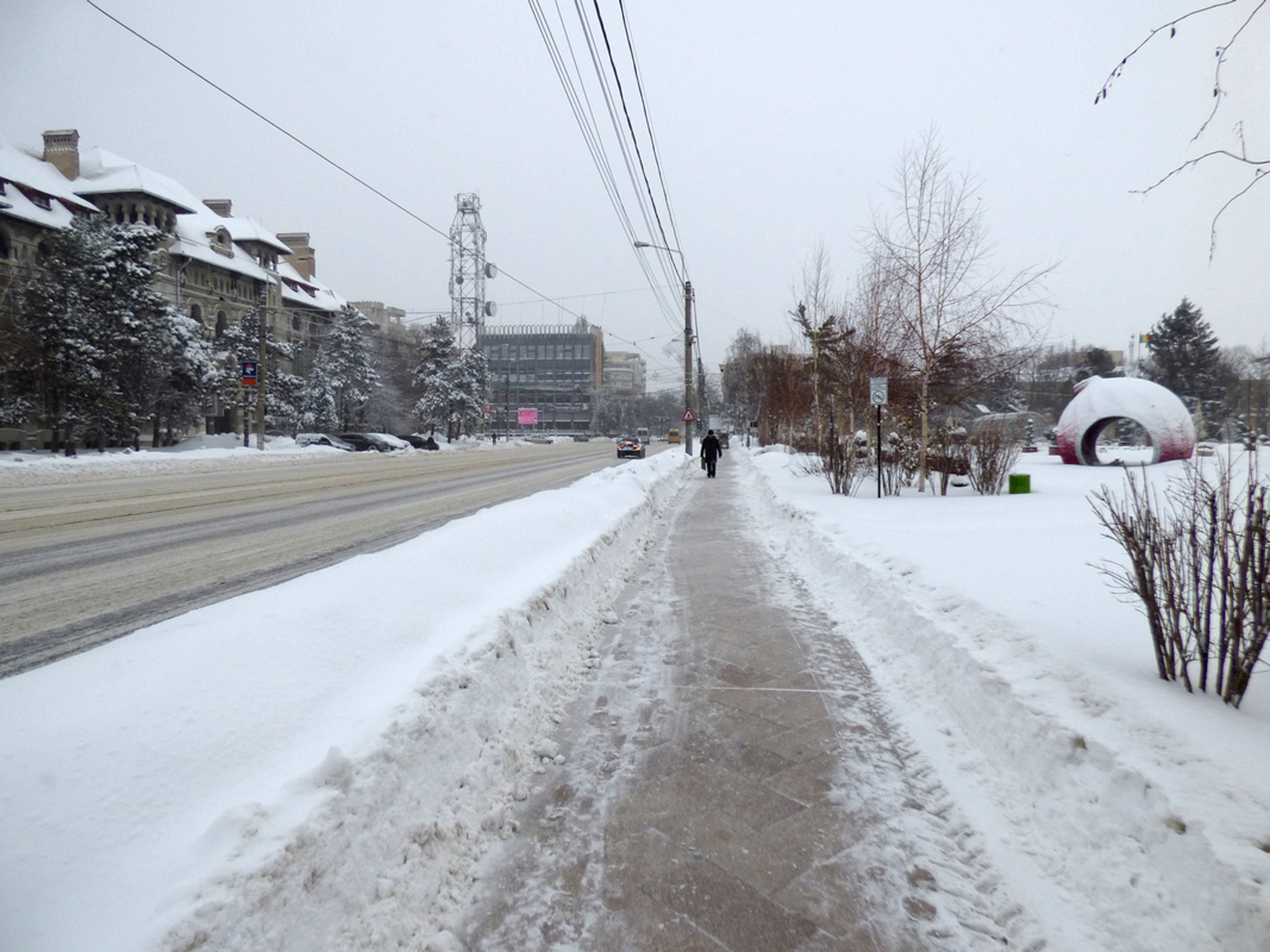 • în unele zone se putea merge în papuci, de bine ce fusese dată zăpadă, în altele aveai nevoie de schiuri ca să poţi răzbate prin troiene • o situaţie absolut de neacceptat se întâlnea în zona supermarket-ului recent construit lângă staţia de autobuz de la Piaţa Concordia