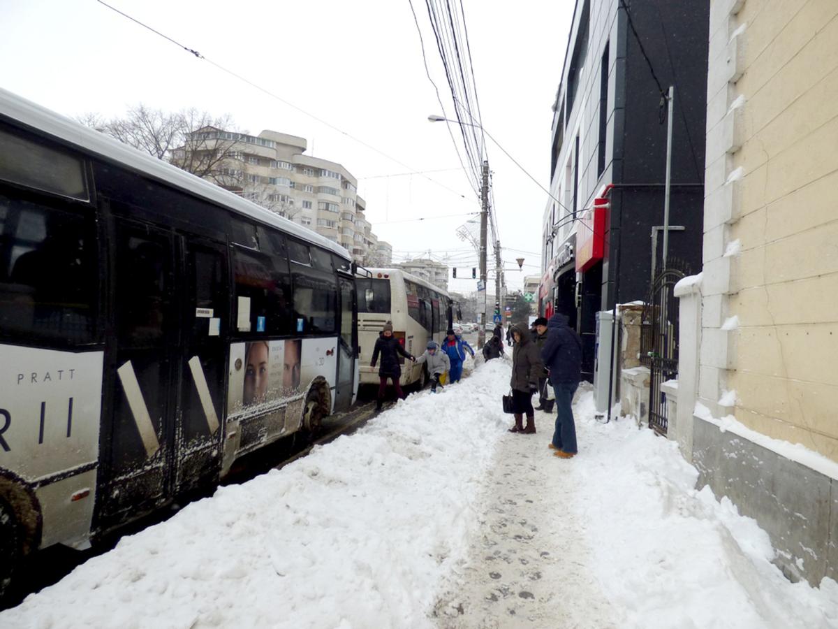 Este inexplicabil de ce şi ieri la prânz staţia de autobuz de la Piaţa Concordia, cea mai a mare şi aglomerată din oraş, cu 12 linii numai ale Braicar - supranumită în ultima perioadă „La pinguini” datorită şirurilor de călători aflaţi sub cerul liber, de când s-a construit acel supermarket care a „mâncat” mult din lăţimea trotuarului - continua să fie blocată de un zid de zăpadă. Doar o singură breşă exista în zidul de zăpadă spre cele 4-5 autobuze care soseau simultan în staţie. Oamenii erau astfel nevoiţi să ia cu asalt nămeţii, chiar şi atunci când un şofer indolent oprea cu uşa în dreptul mormanului de zăpadă.