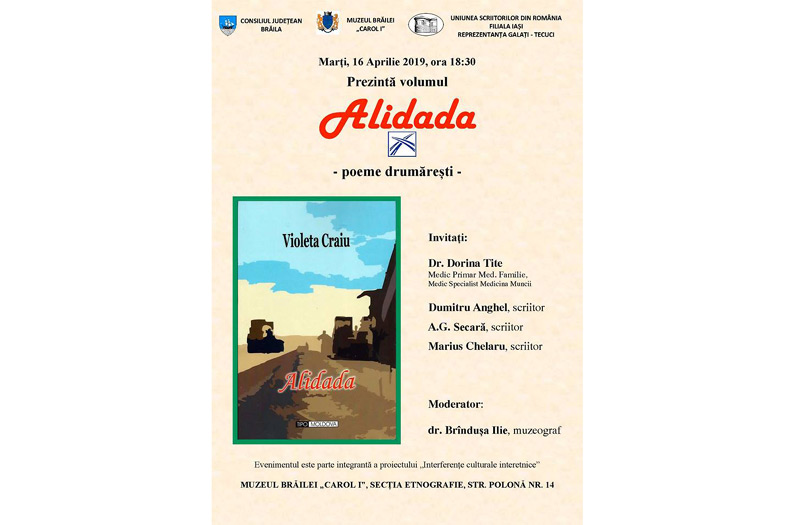 Marţi, 16 aprilie 2019, de la ora 18.30, la sediul secţiei de Etnografie din cadrul Muzeului Brăilei din strada Polonă, nr. 14 va avea loc prezentarea cărţii “Alidada – poeme drumăreşti”, de Violeta Craiu, volum apărut la Editura TipoMoldova Iaşi.