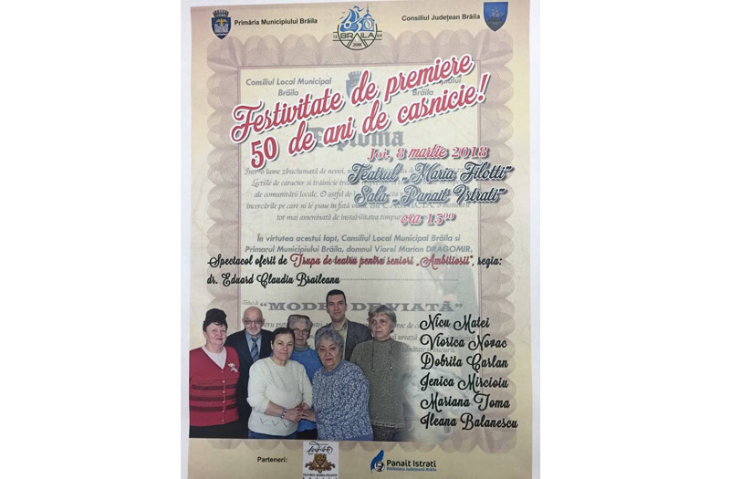 • seniorii de la trupa de teatru care funcţionează în cadrul Bibliotecii Judeţene “Panait Istrati” îi vor delecta pe cei care-şi sărbătoresc nunta de aur