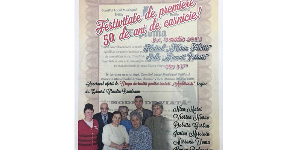 Astăzi, 8 martie, de la ora 15.00, trupa de teatru pentru seniori “Ambiţioşii” din cadrul Bibliotecii Judeţene “Panait Istrati”, coordonată de dr. Eduard Claudiu Brăileanu, şef serviciu Relaţii Publice, va susţine un spectacol în cadrul ceremoniei de premiere a cuplurilor care au împlinit 50 ani de căsnicie. Evenimentul va avea loc la Teatrul “Maria Filotti”, Sala “Panait Istrati, şi este organizat de Primăria Municipiului Brăila. Seniorii de la trupa de teatru care funcţionează în cadrul Bibliotecii Judeţene “Panait Istrati” din anul 2010 îi vor delecta pe cei care-şi sărbătoresc nunta de aur.
