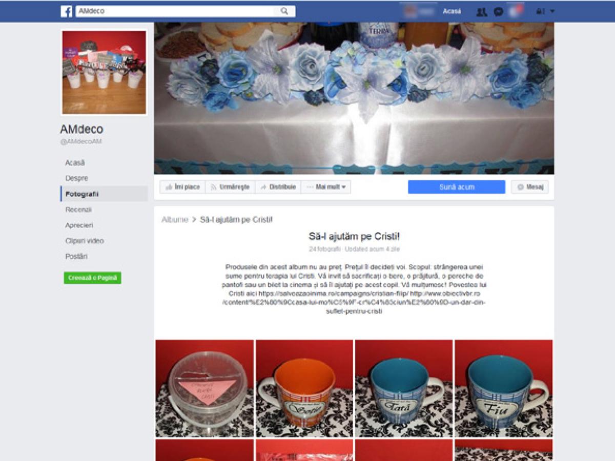 Pe pagina de Facebook AMdeco, în albumul “Să-l ajutăm pe Cristi” găsiţi tot felul de obiecte inedite, de la căni personalizate la ochelari haioşi pentru petreceri, pe care le puteţi achiziţiona în schimbul unei donaţii.