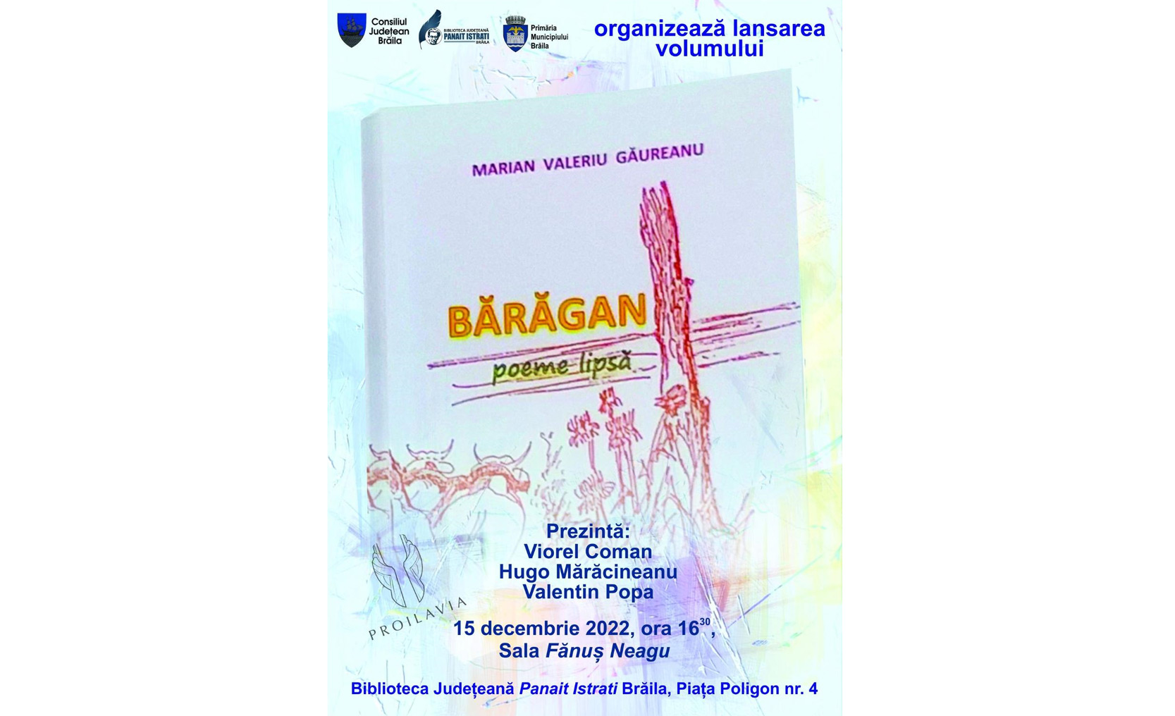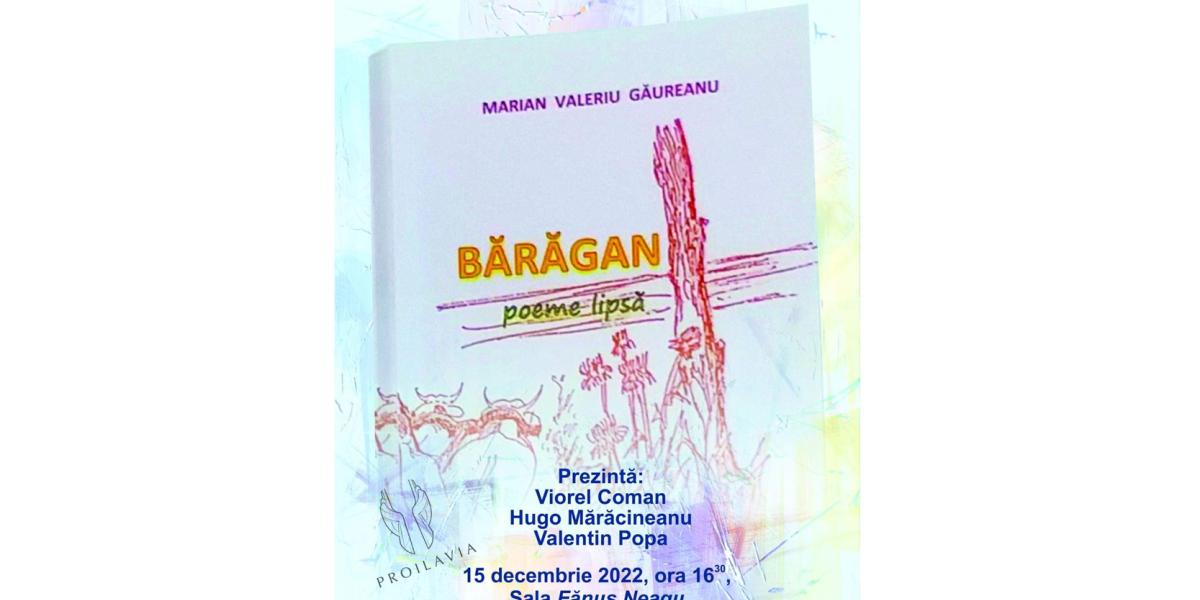 Biblioteca Județeană “Panait Istrati” Brăila vă invită astăzi, 15 decembrie 2022, începând cu ora 16.30, la o nouă lansare de carte - “Bărărăgan: poeme lipsă” semnată de Marian Valeriu Găureanu.