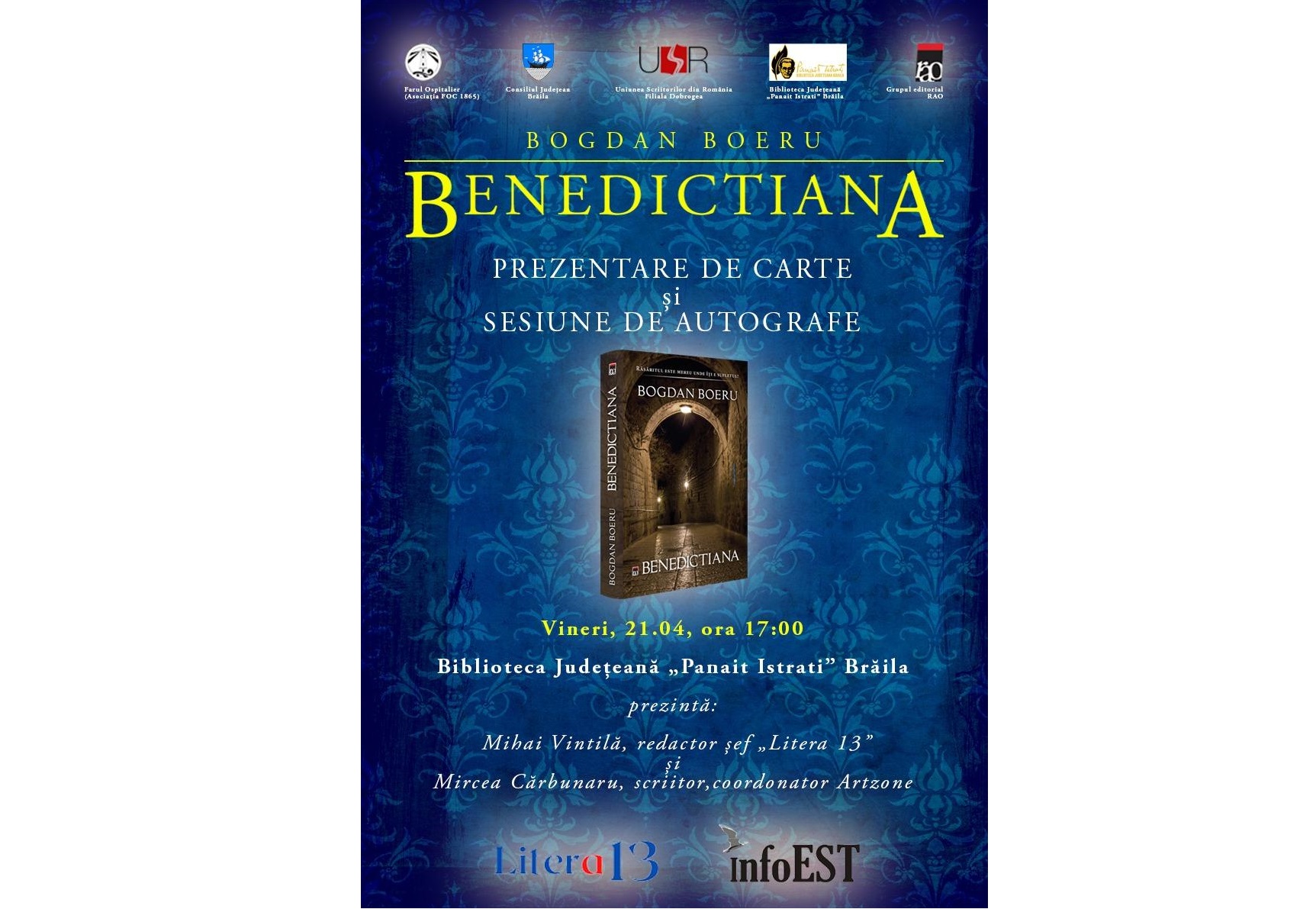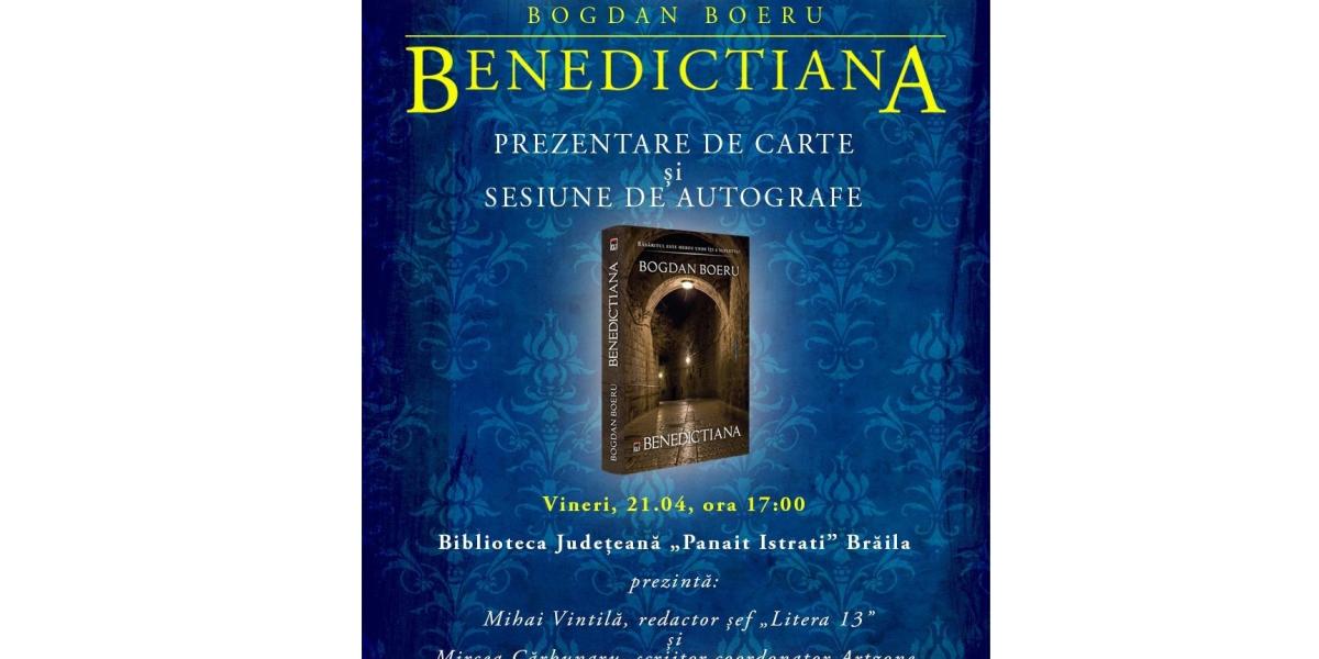 Bogdan Boeru, membru al Filialei Dobrogea a Uniunii Scriitorilor din România, poet, eseist și prozator, își lansează la Brăila cel mai nou roman, “Benedictiana”. Evenimentul are loc la Biblioteca Județeană “Panait Istrati” vineri, 21 aprilie 2023, începând cu ora 17.00 la sala ”Fănuș Neagu”.