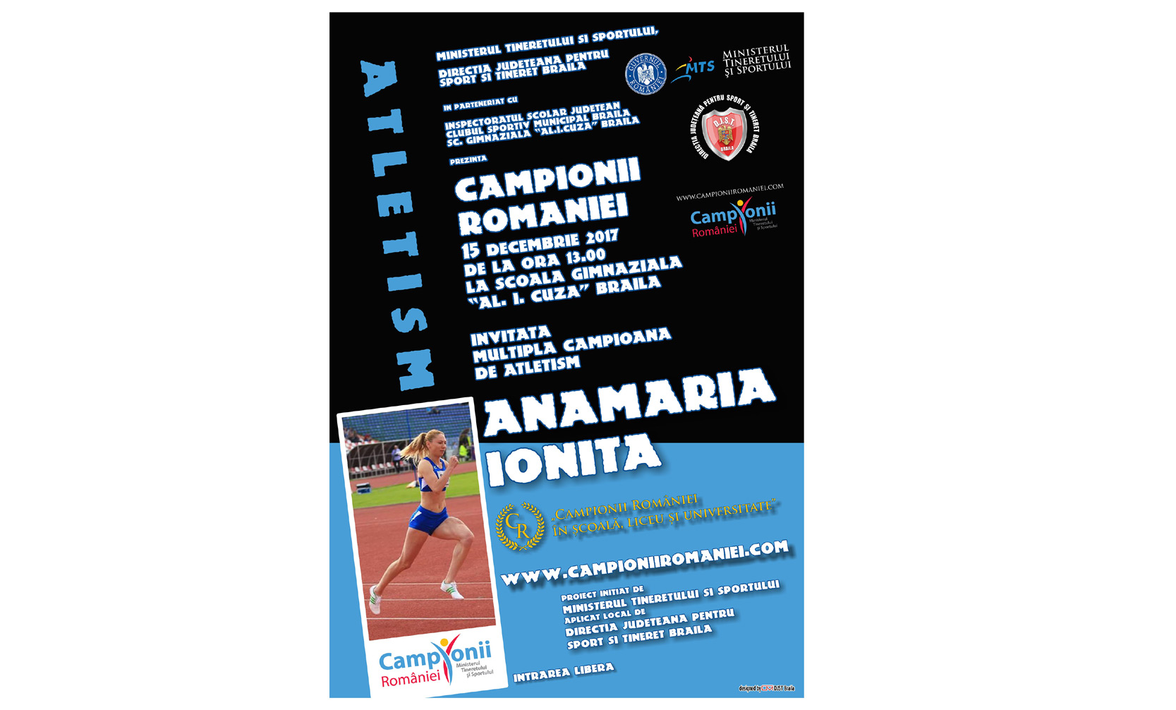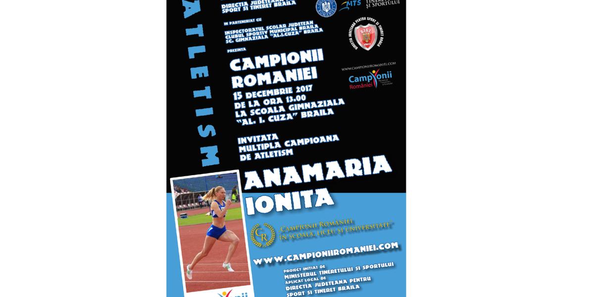 Direcţia Judeţeană pentru Sport şi Tineret Brăila organizează, astăzi, de la ora 13.00, în sala de sport a şcolii “Alexandru Ioan Cuza”, o nouă întâlnire a valorilor sportive de pe plan local cu elevii, invitată fiind atleta Anamaria Ioniţă, o sportivă cu un palmares impresionant. Atletă încă în activitate, având în acest moment dublă legitimare, CSM Brăila - CSU Piteşti, Anamaria Ioniţă este multiplă campioană naţională, medaliată în competiţiile naţionale şi internaţionale. Anul 2016 i-a adus medalia de bronz la Campionatul Mondial de la Portland în proba de ştafetă 4X400 m plat şi tot anul trecut a participat cu lotul naţional al României la Jocurile Olimpice de vară din Brazilia.