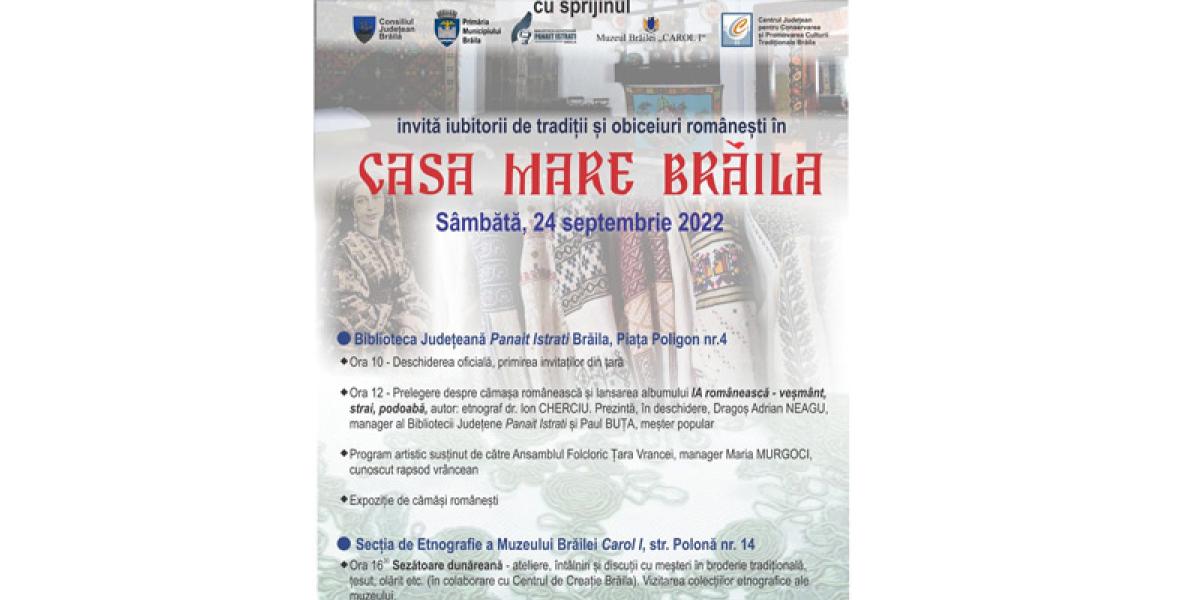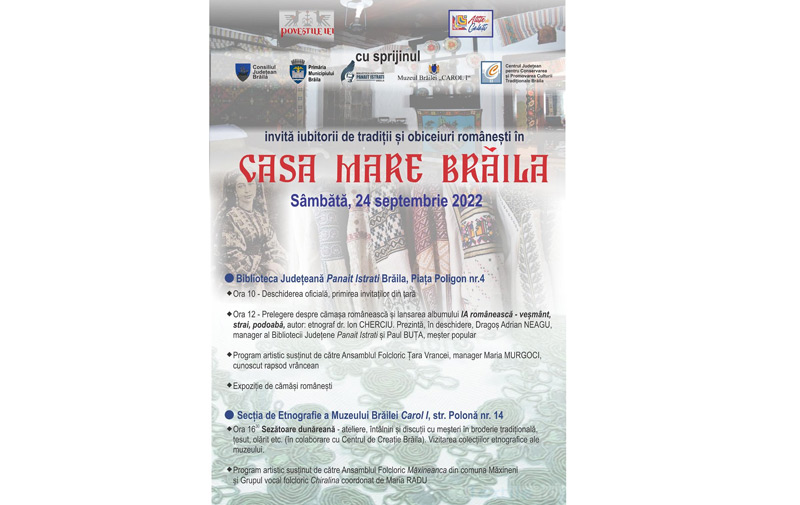 Sâmbătă, 24 septembrie, Biblioteca Județeană “Panait Istrati” la evenimentul “CASA MARE BRĂILA”, dedicat iubitorilor de tradiții. Alături de invitații sosiți din țară, brăilenii pot participa începând cu ora 12.00 la lansarea albumului „IA românească – veșmânt, strai, podoabă”, autor dr. Ion Cherciu, etnograf. Lansarea va fi prezentată de Dragoș Adrian Neagu, directorul Bibliotecii Județene și Paul Buța, meșter popular.