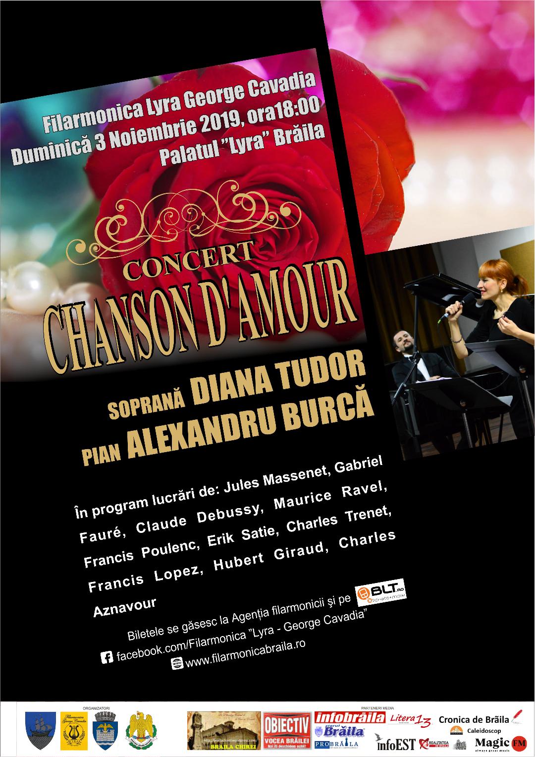 Duminică, 3 noiembrie, de la ora18:00, în Sala de Concerte “Doctor NicuTeodorescu” din Palatul “Lyra” Brăila va avea loc recitalul “Chanson d'amour”, susţinut de soprana Diana Tudor şi pianistul Alexandru Burcă.