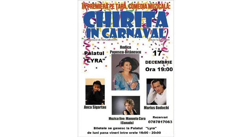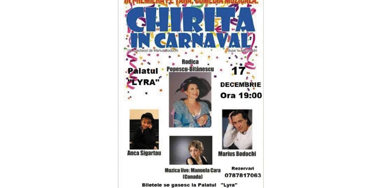 Luni, 17 decembrie 2018, ora 19.00, pe scena Palatului '“Lyra” din Brăila vor urca mari actori ai teatrului românesc. Este vorba despre Rodica Popescu Bitănescu, Anca Sigartau, Manuela Clara şi Marius Bodoghi, care vor juca în piesa “Chiriţa în carnaval”, după Vasile Alecsandri.