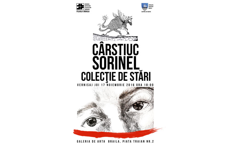 Joi, 17 noiembrie 2016, ora 18.00, la Galeria de Artă Brăila, din Piaţa Traian nr. 2 va avea loc vernisajul expoziţiei de grafică “Colecţie de stări” semnată de Sorinel Cârstiuc. Manifestarea este organizată de Filiala Brăila a Uniunii Artiştilor Plastici din România, aceasta fiind prima expoziţie personală a tânărului artist în Galeria de Arta Braila.