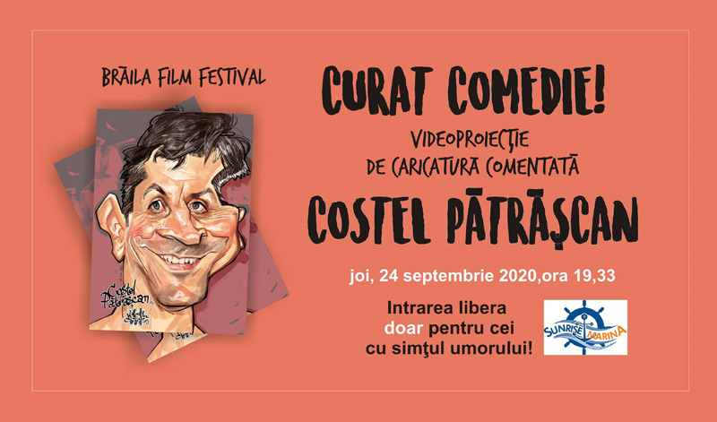 Cea de-a doua ediţie Brăila Film Festival, eveniment organizat de Asociaţia Culturală “CineFeel” Brăila, vine cu o nouă surpriză. Este vorba de spectacolul “Curat comedie”, o videoproiecţie de caricatură comentată, iar autorul acesteia, îndrăgitul caricaturist Costel Pătrăşcan, promite că se va râde mult. Evenimentul are loc astăzi, de la ora 19.33, pe terasa Sunrise Marina Wine Bistro, intrarea fiind liberă.