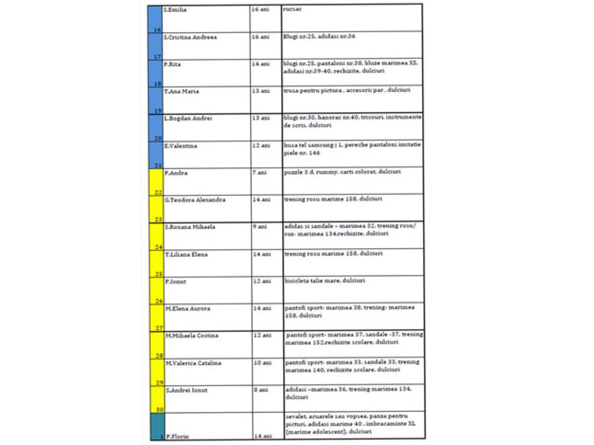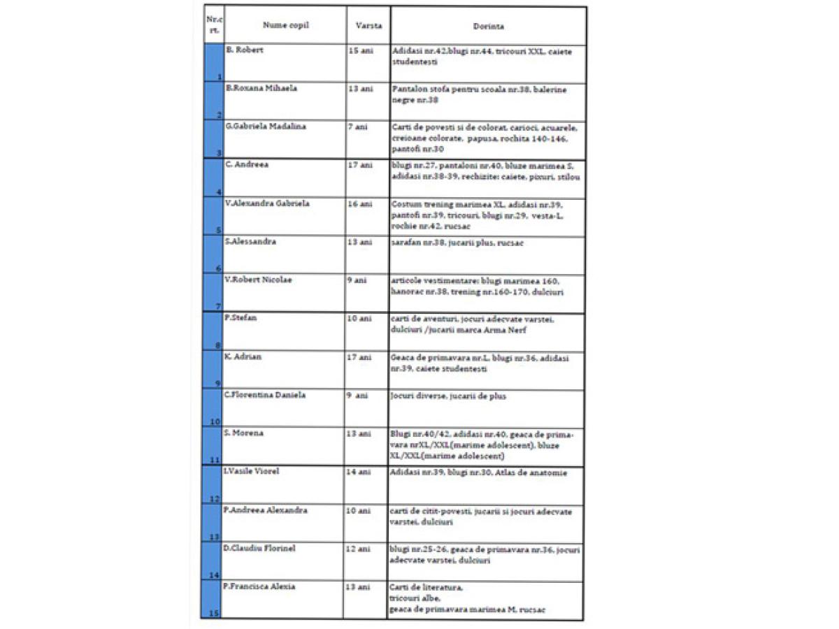 Lista completă cu lucrurile de care au nevoie copiii, în funcţie de vârstă şi gen, este publicată integral în ediţia online a cotidianului nostru.