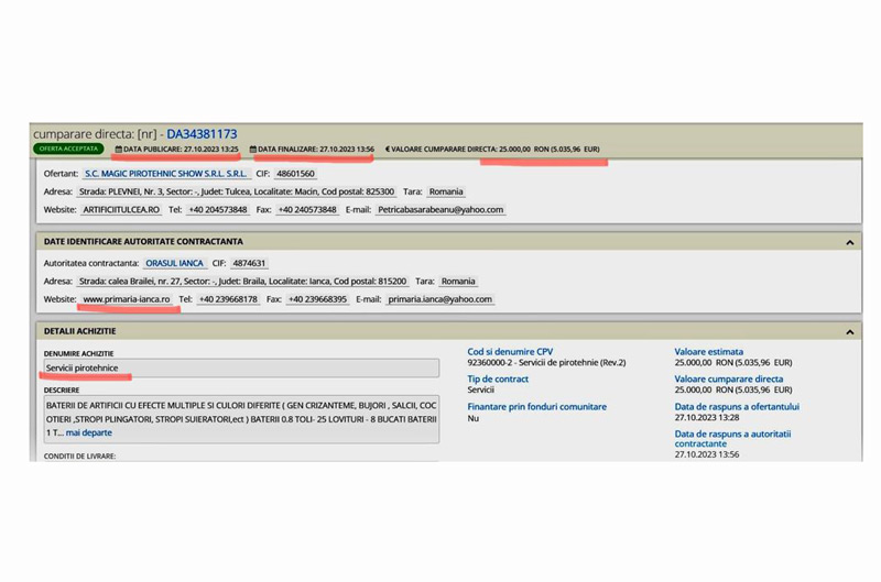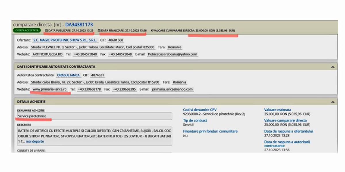 “Chiar în ziua de 27.10.2023, când intra în vigoare celebra OUG nr. 90 privind aprobarea măsurilor de reducere a cheltuielilor bugetare pe anul 2023, Primăria Ianca achiziționa de pe SEAP articole pirotehice pentru Revelion în valoare de 25.000 lei. În disprețul legii și fără nicio îngrijorare pentru banii oamenilor care contribuie la bugetul local, în ziua în care trebuia să înceapă reducerile de cheltuieli, prima grijă a primarului Chiriță a fost să își facă provizii de artificii pentru Revelion! Asta este o dovadă că nici măcar legea nu îl oprește pe primarul Chiriță Fănel să arunce cu banii publici după bunul plac. Asistăm la un exemplu clar de sfidare și de aroganță, prin care Chiriță vrea să demonstreze că, la Ianca, el este cel care face legea!”, critică Adin Boboc, subprefectul PNL, administrația PSD din Ianca. Sursa citată continuă: “Și ca să vedeți cât de repede merg treburile când există "organizare", anunțul de participare la licitație a fost postat pe SEAP pe 27.10.2023, la ora 13,25, iar contractul a fost atribuit în 31 de minute, mai exact pe 27.10.2023 la ora 13,56. Trei săptămâni mai târziu, mai exact pe 16.11.2023, Primăria Ianca se mai împiedică de niște bani, peste 16.000 lei, fără TVA, pe care îi aruncă pe vopsirea unui avion, care ar trebui să fie simbolul orașului. Cu suma această imensă, cu siguranță a fost vopsit și leopardul, nu doar gardul”.