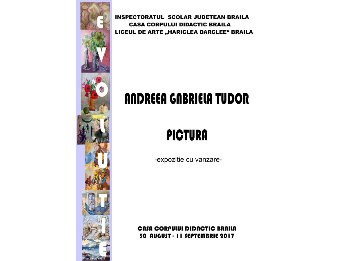 “Andreea Gabriela Tudor este elevă a Liceului de Artă «Hariclea Darclee», în clasa a XI-a. Are un palmares impresionant, cuprinzând peste 200 de premii la concursuri judeţene, naţionale, internaţionale, precum şi opt expoziţii personale şi participări la expoziţii de grup şi s-a remarcat prin implicare în numeroase proiecte ale Liceului de Arte şi în afara acestuia. Extrem de muncitoare, îşi dedică, cu pasiune, timpul şi energia pentru a se manifesta artistic, în orice împrejurare. Orice tip de suport devine pentru Andreea Gabriela Tudor un spaţiu plastic, pe care a învăţat să-l valorifice, prin studiu, prin exerciţiu. Este într-o permanentă căutare de frumos, de a crea imagini noi, pline de culoare şi inocenţă, inedite”, spune prof. Elisabeta Volcu.