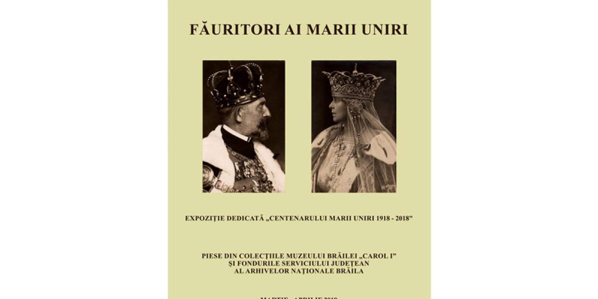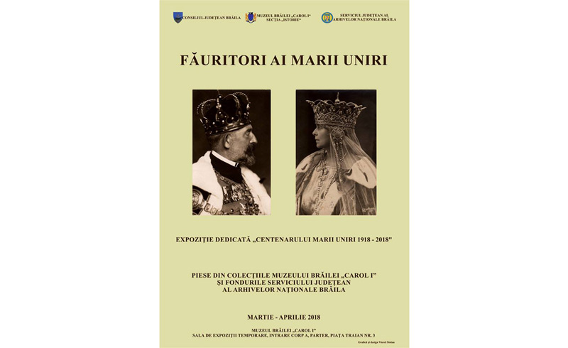 Muzeul Brăilei “Carol I” - Secţia Istorie, organizează astăzi, 27 martie, ora 11.00, la sediul din Piaţa Traian, nr. 3, vernisajul expoziţiei “Făuritori ai Marii Uniri”, realizată în colaborare cu Serviciul Judeţean al Arhivelor Naţionale – Brăila şi dedicată Centenarului Marii Uniri (1918 – 2018).