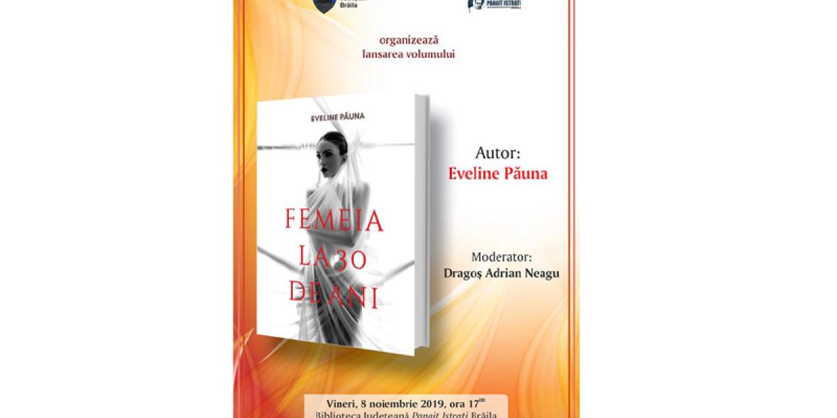 Vineri, 8 noiembrie, de la ora 17.00, la Biblioteca Judeţeană “Panait Istrati” Brăila, sala “Fănuş Neagu”, va avea loc lansarea volumului “Femeia la 30 de ani” de Eveline Păuna, iar evenimentul va fi moderat de Dragoş Adrian Neagu, directorul instituţiei gazdă.
