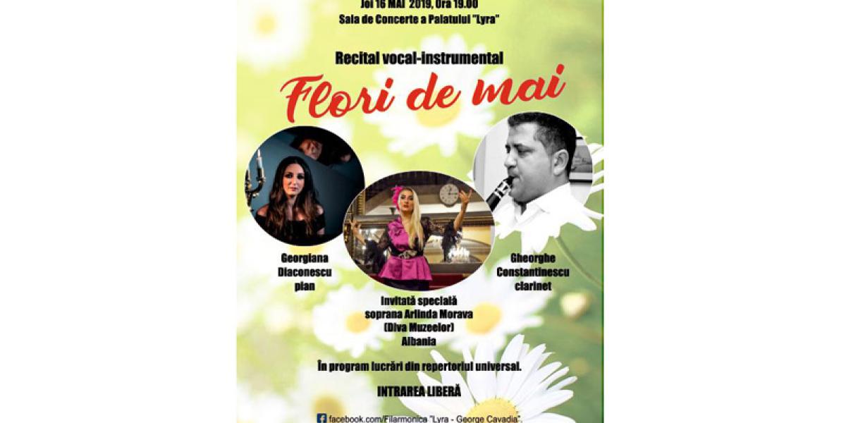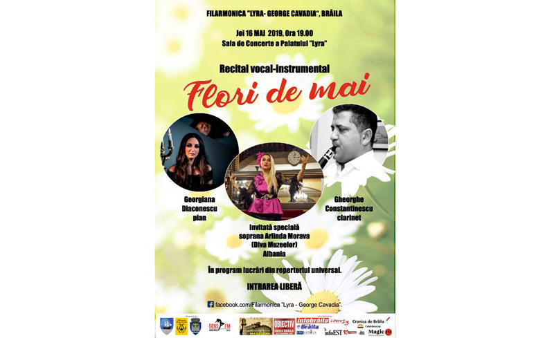 Joi, 16 Mai 2019, de la ora 19:00, în Sala de Concerte a Palatului “Lyra” din Brăila va avea loc recitalul vocal-instrumental “Flori de mai”. Spectacolul este susţinut de: ARLINDA MORAVA - soprană (Diva Muzeelor), Albania; GHEORGHE CONSTANTINESCU - clarinet, Filarmonica Brăila;