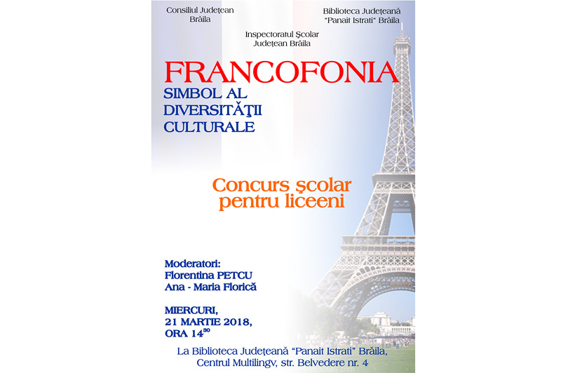 Biblioteca Judeţeană “Panait Istrati” Brăila organizează astăzi, miercuri, 21 martie 2018, ora 14.30, Concursul şcolar “Francofonia – simbol al diversităţii”. Concursul este organizat cu ocazia Zilei Internaţionale a Francofoniei, sărbătorită anual pe 20 martie şi implică elevi de gimnaziu şi liceu, coordonaţi de profesorii de limba franceză din şcolile participante.