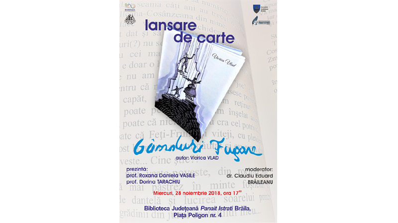 Astăzi, 28 noiembrie 2018, ora 17.00, la Biblioteca Judeţeană “Panait Istrati” Brăila, sala “Fănuş Neagu”, are loc lansarea volumului “Gânduri fugare”, autor Viorica Vlad. Evenimentul va fi prezentat de prof. Roxana Daniela Vasile şi prof. Dorina Tarachiu şi moderat de dr. Eduard Claudiu Brăileanu, şef serviciu în cadrul bibliotecii.