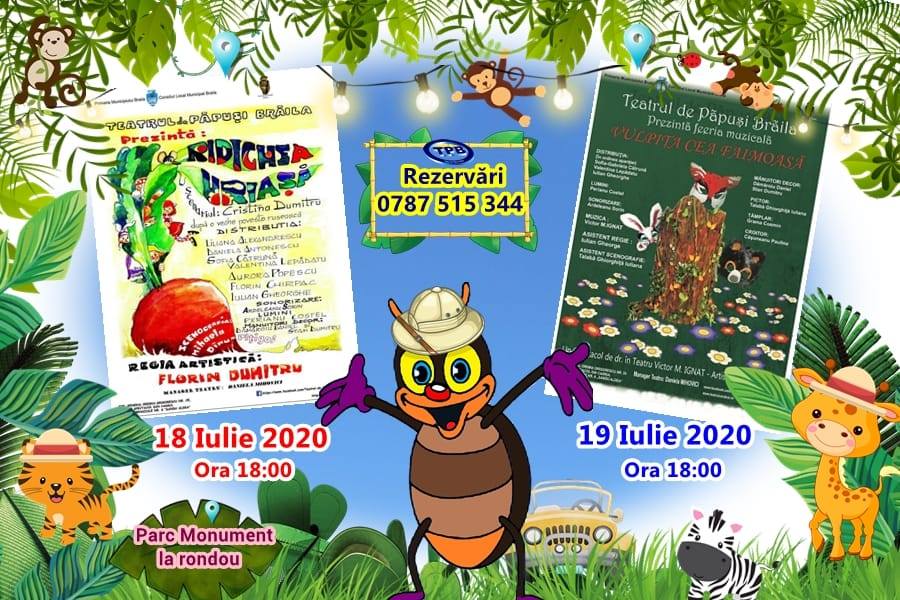 Sâmbătă, 18 iulie, de la ora 18.00, actorii Teatrului de Păpuși CĂRĂBUȘ îi invită pe spectatorii de toate vârstele în Parcul MONUMENT, la Rondou, pentru a viziona spectacolul „RIDICHEA URIAȘĂ". Duminică, 19 iulie, tot de la ora 18.00, se va juca spectacolul "VULPIȚA CEA FAIMOASĂ".