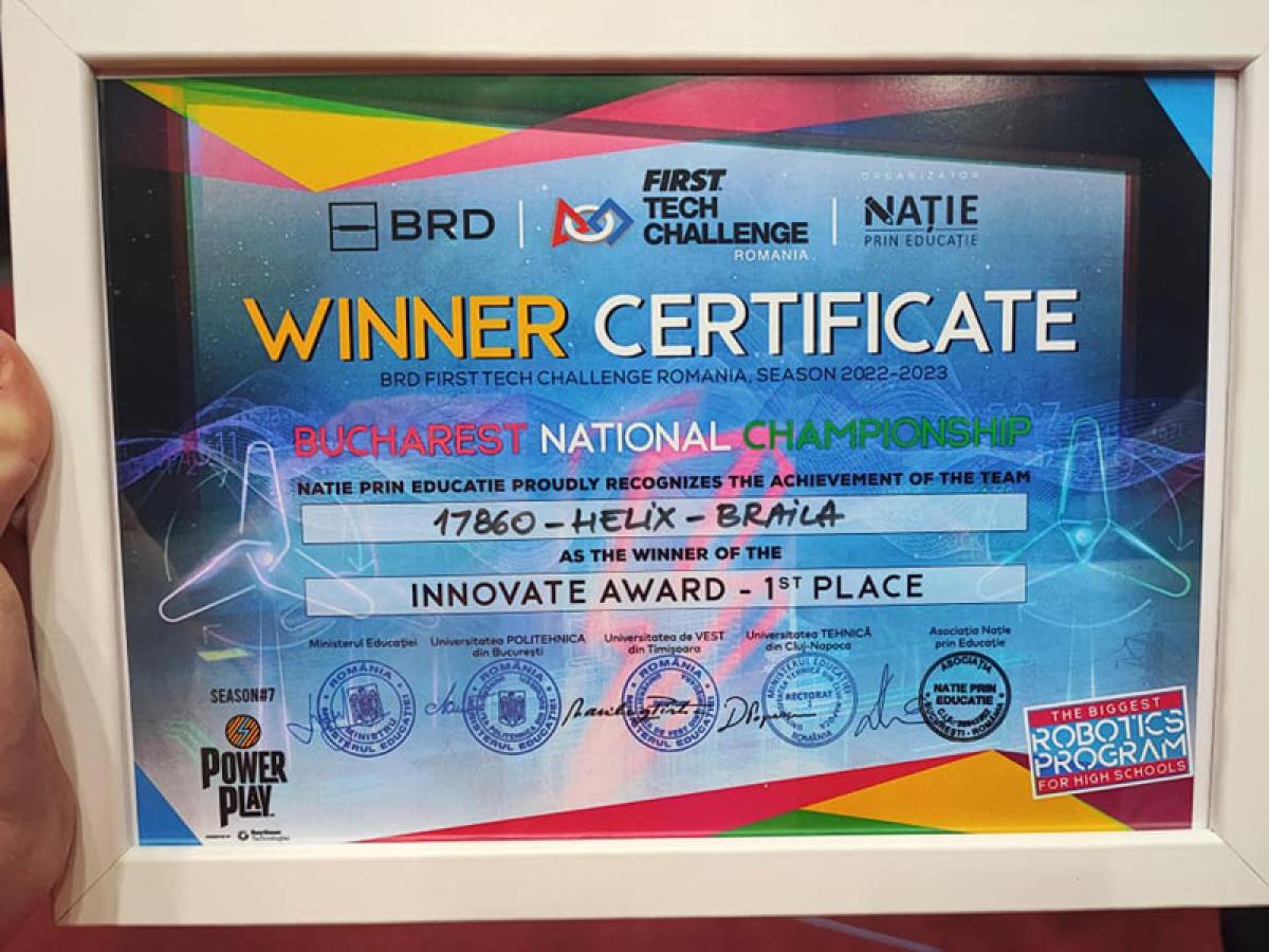 Odată încheiate meciurile, juriul competiției BRD First Tech Challenge le-a acordat elevilor brăileni premiul I la categoria “Innovate Award” (Inovație). Premiul se acordă pentru ingeniozitate, creativitate și inventivitate. Elementele acestui premiu includ designul elegant, robustețea și gândirea “out of the box” legată de design și competitivitatea ansamblului.