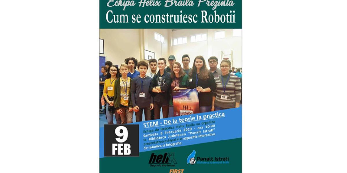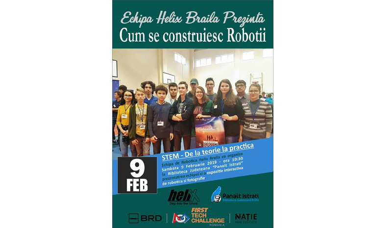 Sâmbătă, 9 februarie, începând cu ora 10.30, la Biblioteca Judeţeană “Panait Istrati” va avea loc expoziţia interactivă “Cum se construiesc roboţii”, organizată de Helix Robotics Team Brăila. Participanţii la eveniment pot face cunoştinţă cu cei mai simpatici roboţei şi pot lua parte la prezentări, jocuri şi concursuri, iar pentru cei mici poate fi un moment foarte bun de orientare către o profesie minunată. De asemenea, va avea loc şi o expoziţie fotografică organizată de Alexia Mihăilă şi Silviu Octav Gheorghe, membri în echipa Helix Robotics din cadrul Clubului de Robotică al bibliotecii.