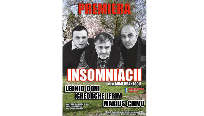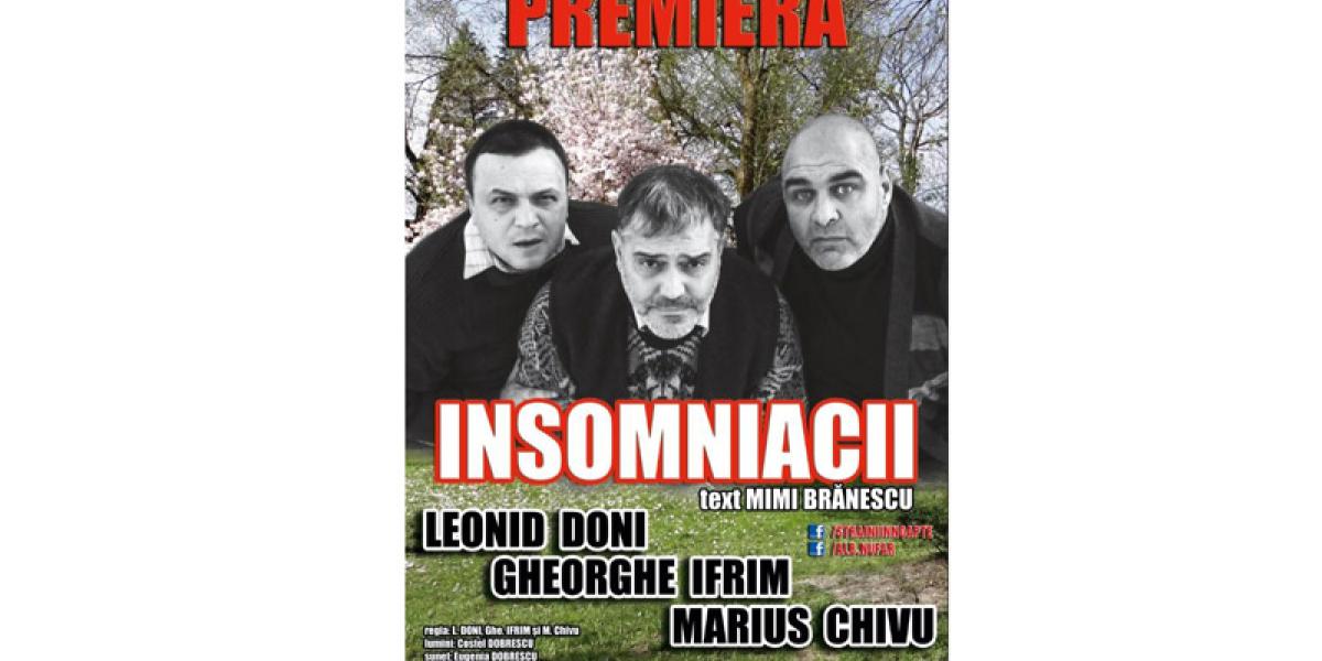 Marţi, 11 iunie 2019, de la ora 20:00, Palatul “Lyra” găzduieşte o premieră la Brăila. Este vorba despre spectacolul “Insomniacii”, un text de Mimi Brănescu. Distribuţia, formată din Leonid Doni, Gheorghe Ifrim şi Marius Chivu face din această piesă o remarcabilă comedie de situaţii.
