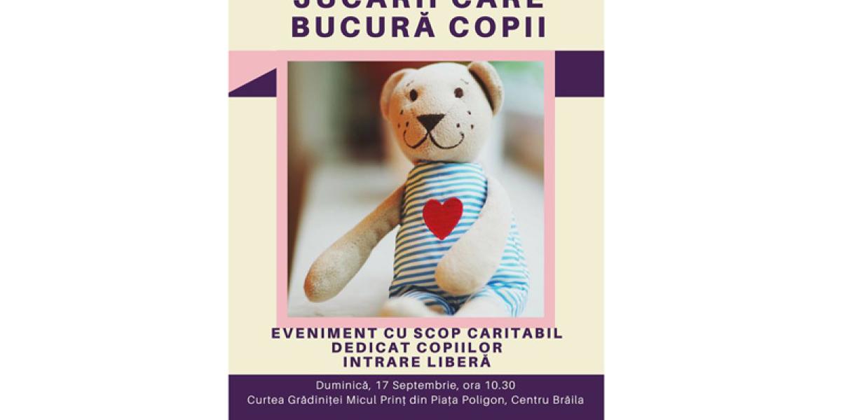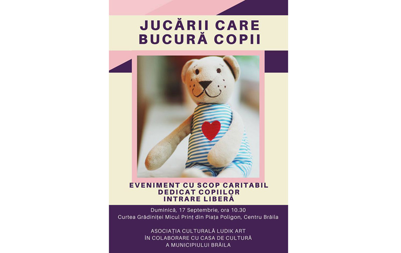 Duminică, 17 septembrie 2017, începând cu ora 10.30, în curtea fostei grădiniţe “Micul Prinţ”, din Piaţa Poligon, sub genericul “Jucării care bucură copii!”, are loc o acţiune organizată de Asociaţia Culturală “LudikArt” şi Casa de Cultură a Municipiului Brăila. În opinia organizatorilor, evenimentul reprezintă ocazia perfectă pentru transformarea spaţiului respectiv într-un loc care împleteşte jocul cu frumosul şi bucuria de a fi înţelept şi darnic cu cei din jur.