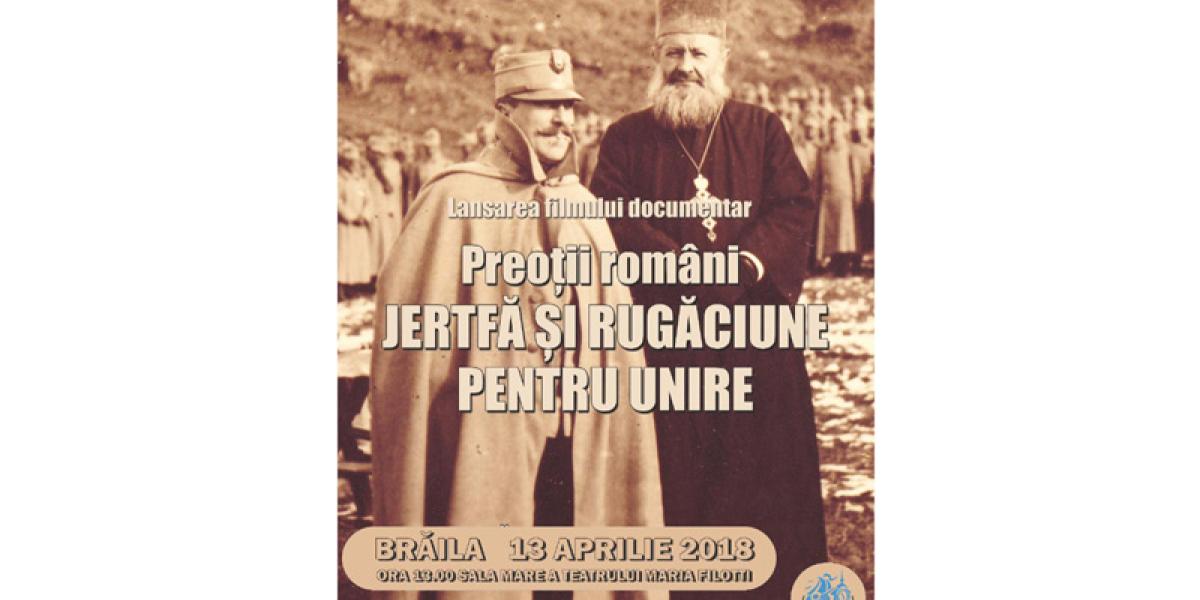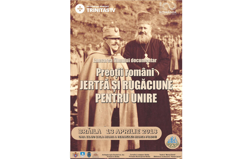 Filmul documentar “Preoţii români – Jertfă şi Rugăciune pentru Unire” reuneşte mărturii, date istorice şi interviuri în legătură cu rolul clericilor în timpul Primului Război Mondial. În deschiderea evenimentului de la Sala Mare a Teatrului “Maria Filotti” vor lua cuvântul Dragoş Neagu, managerul Bibliotecii Judeţene “Panait Istrati”, Cristina Liberis, jurnalist şi realizator al filmului şi Î.P.S. Casian Crăciun, Arhiepiscopul Dunării de Jos.