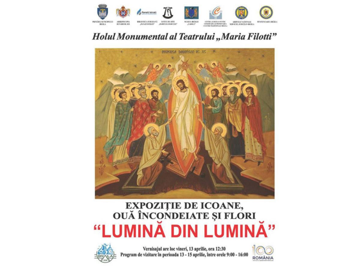 Astăzi, 13 aprilie, de Izvorul Tămăduirii, de la ora 12.30, în Holul Monumental al Teatrului “Maria Filotti” va avea loc vernisajul unei expoziţii de icoane, ouă încondeiate şi flori, după care, de la ora 13.00, în Sala Mare a Teatrului va urma vizionarea documentarului “Preoţii români – Jertfă şi Rugăciune pentru Unire”.