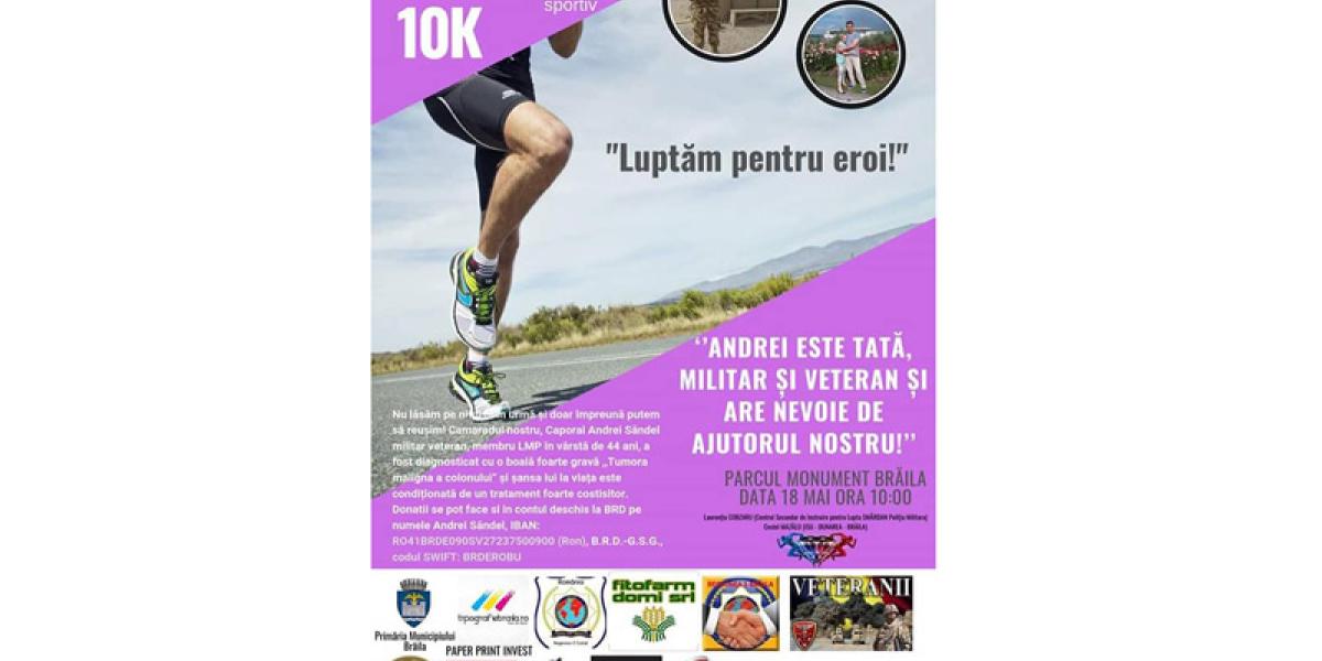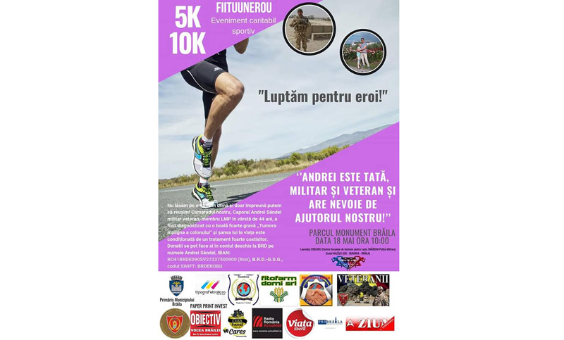 Sub sloganul “Luptăm pentru eroi!', alergătorii Laurenţiu Cobzaru (Poliţia Militară) şi Costel Mazâlu (ISU Brăila) vă îndeamnă să fiţi alături de caporalul brăilean Andrei Săndel (44 de ani), diagnosticat cu tumoră malignă a colonului. Descris de colegii lui ca un “om măreţ, tată, militar şi veteran”, Andrei Săndel a dus mereu o luptă şi nu a renunţat niciodată în cei peste 23 de ani de activitate şi nici în cele trei misiuni din teatrele de operaţii. Acesta a demonstrat că este un militar model şi un luptător neînfricat, fiind mereu alături de colegii săi din Batalionul de Artilerie 285 “Vlaicu Vodă” din Brăila, dar şi de colegii alături de care a participat în misiunile din Afganistan în 2005 şi 2008 cu Batalionul 300 “Sfântul Andrei” din Galaţi şi în 2010 cu Batalionul 811 Dej “Dragonii Transilvani”. Însă acum, diagnosticul pus de medici este mult prea dur chiar şi pentru un erou, un adevăr mult prea dureros şi o veste mult prea greu de dus. Dar dragostea nemăsurată pentru familie, ţară şi semenii săi îi dau putere lui Andrei să meargă mai departe, iar noi putem să îl ajutăm să adune banii necesari pentru tratamentul mult prea costisitor pentru el şi familia lui.