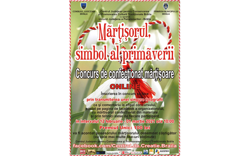Centrul Județean pentru Conservarea și Promovarea Culturii Tradiționale (Centrul de Creație) Brăila, cu sprijinul Uniunii Județene a Pensionarilor, Consiliului Județean și Primăriei Municipiului Brăila organizează, zilele acestea, concursul online de confecționat mărțișoare intitulat "Mărțișorul, simbol al primăverii".