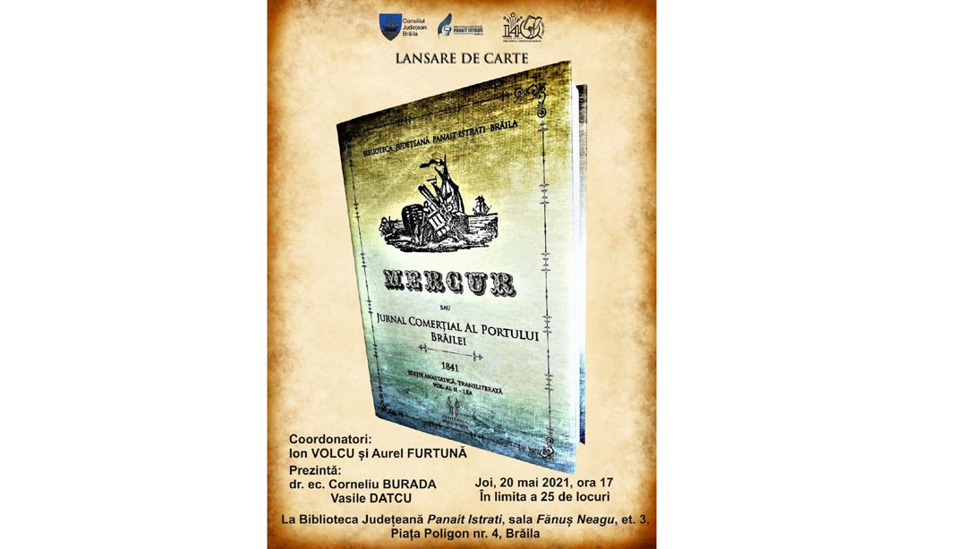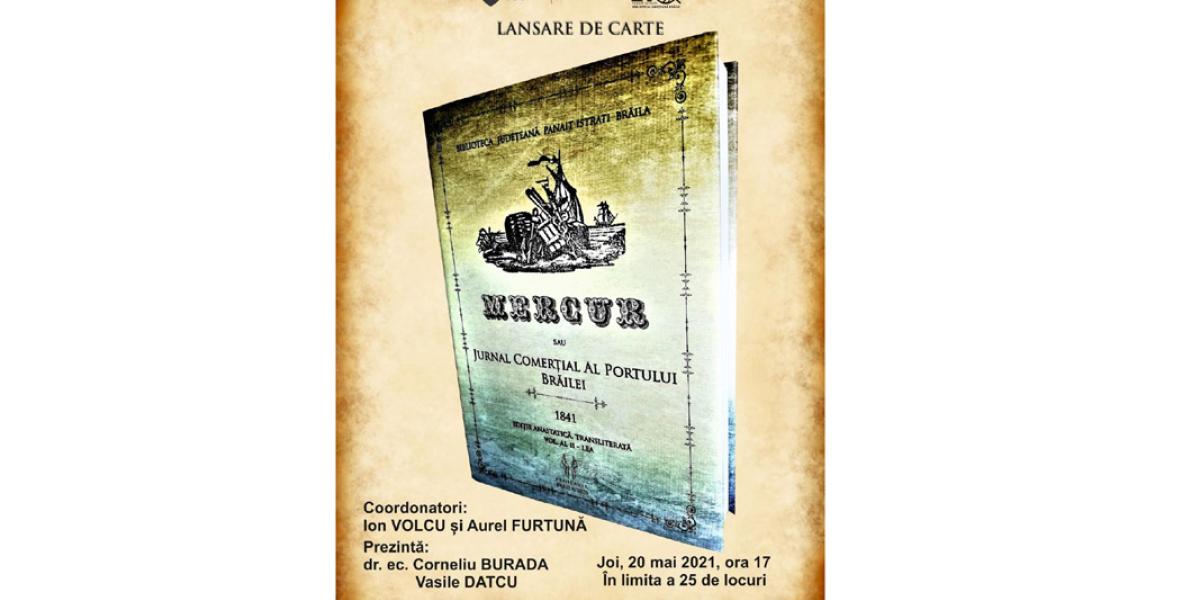 Biblioteca Județeană “Panait Istrati" Brăila vă invită joi, 20 mai 2020, ora 17.00, să participați la lansarea volumului “Mercur sau Jurnal Comerțial al Portului Brăilei, 1841”, volumul 2, ediție anastatică, transliterată și îngrijită de Ion Volcu și Aurel Furtună. Lucrarea a apărut în 2020 la Editura Proilavia a Bibliotecii, cu sprijinul Consiliului Județean Brăila.