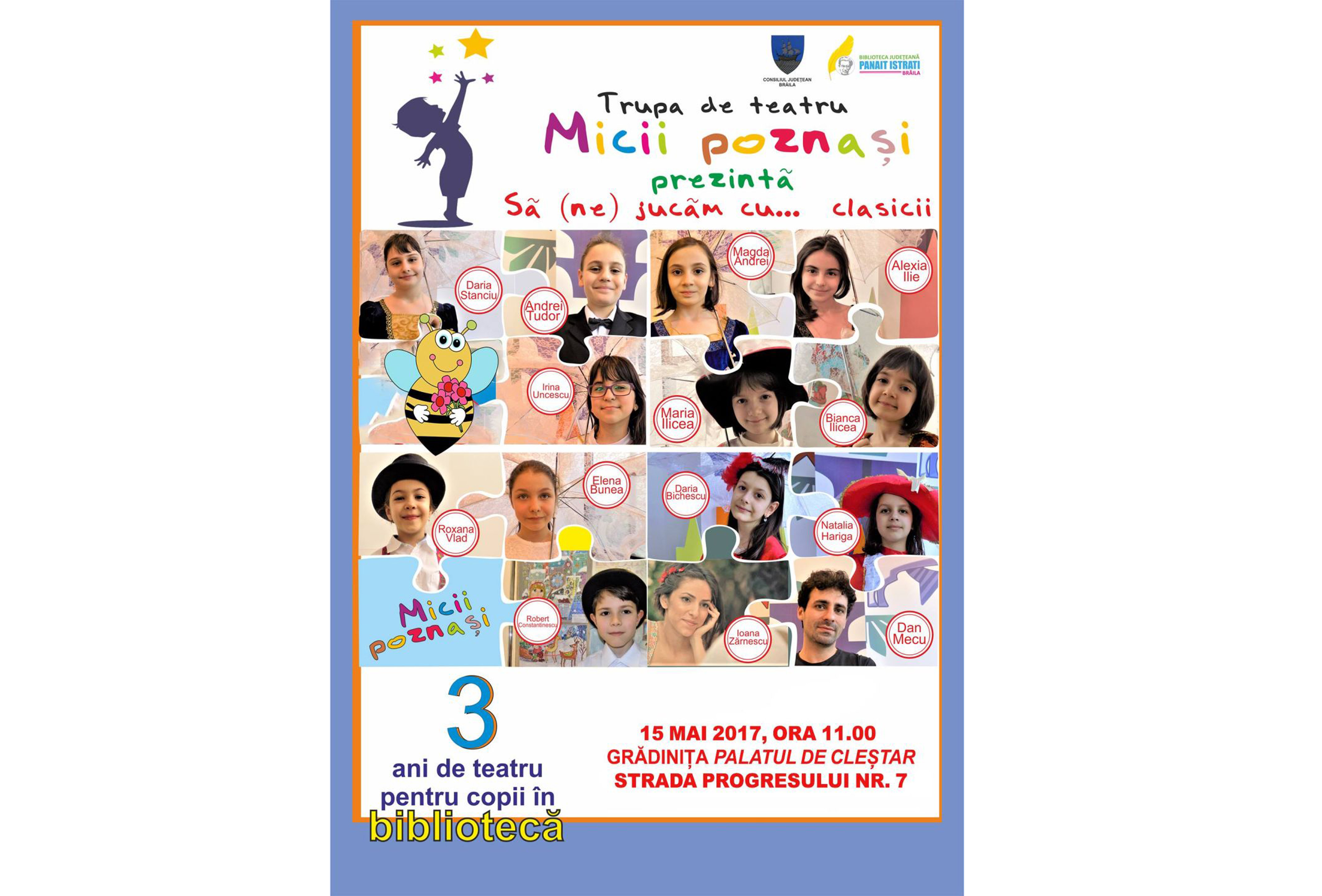 Datorită succesului pe care spectacolul “Să (ne) jucăm cu… clasicii” l-a avut la bibliotecă la premiera din martie, când trupa a împlinit 3 ani de la înfiinţare, micii actori se pregătesc să reia această punere în scenă.