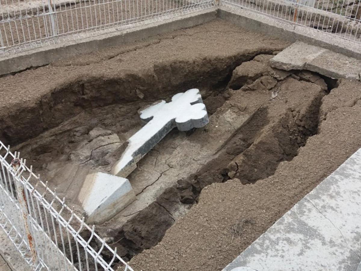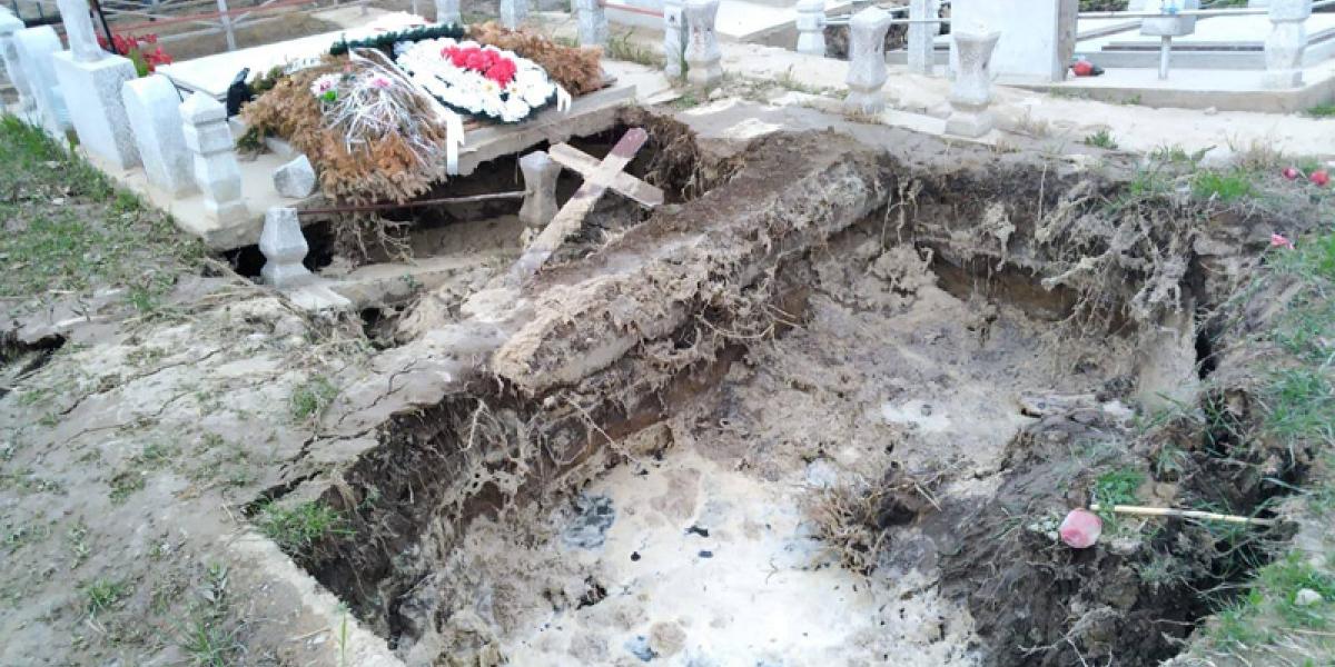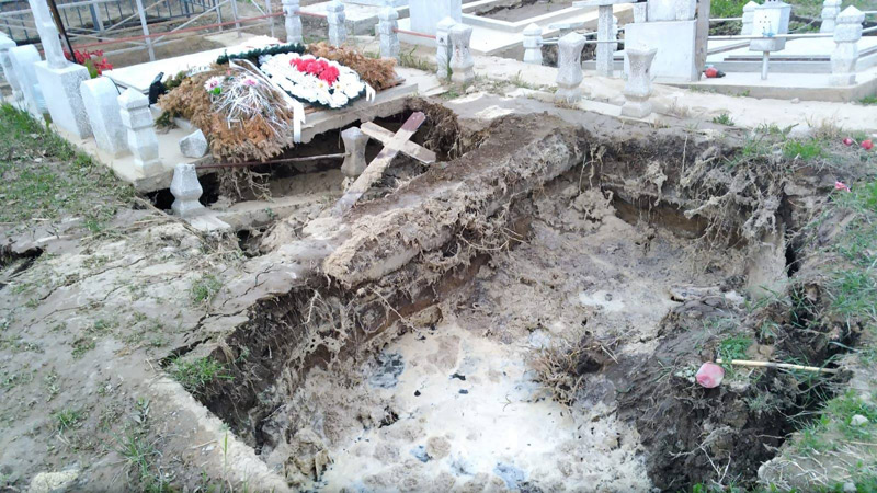 • terenul pe care sunt amplasate locurile de veci a cedat din cauza infiltrării unei mari cantităţi de apă, pe fondul unei avarii apărute la conducta care alimentează localitatea • după cum explică reprezentanţii CUP “Dunărea”, avaria s-a produs la oarecare distanţă de cimitir, însă apa s-a infiltrat printr-o hrubă rămasă în subteran după ce s-a furat fosta conductă care alimenta pe vremuri, cu apă brută, Combinatul de la Chiscani