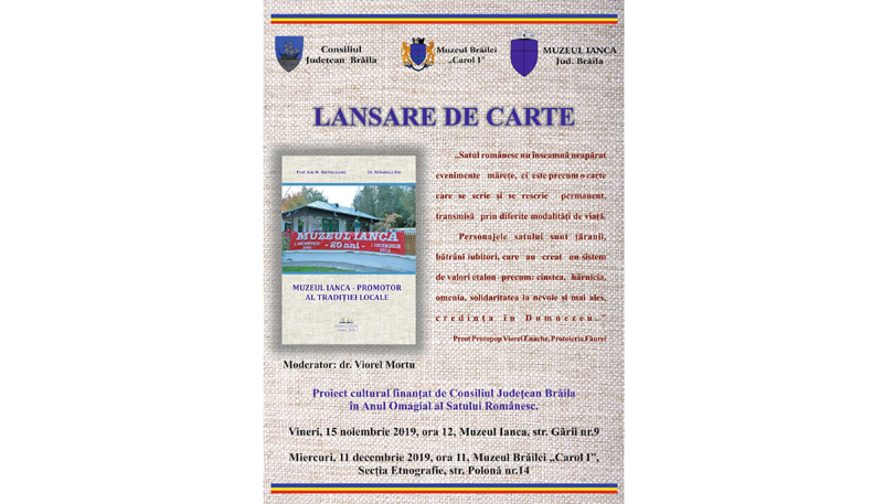 Astăzi, 11 decembrie 2019, de la ora 11,00 la Secţia “Etnografie” a Muzeului Brăilei “Carol I” se lansează cartea “Muzeul Ianca – promotor al tradiţiei locale”, autori: profesor Ion Bărbuceanu şi dr. Brînduşa Ilie. Cartea a apărut la Editura Lucas, iar Secţia “Etnografie” a Muzeului Brăilei “Carol I” a fost partener în cadrul proiectului “Muzeul Ianca – promotor al tradiţiei locale”, prin participarea dr. Brînduşa Ilie, muzeograf. Proiectul s-a desfăşurat în perioada septembrie-noiembrie, a fost realizat cu ocazia Anului Omagial al Satului Românesc şi a fost finanţat de Consiliul Judeţean Brăila. Organizator al proiectului: Muzeul Ianca, reprezentat de profesorul Ion Bărbuceanu, Parohia nr. 1 Ianca, Liceul Teoretic “Constatin Angelescu” Ianca şi Biblioteca din comuna Mircea Vodă.
