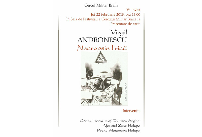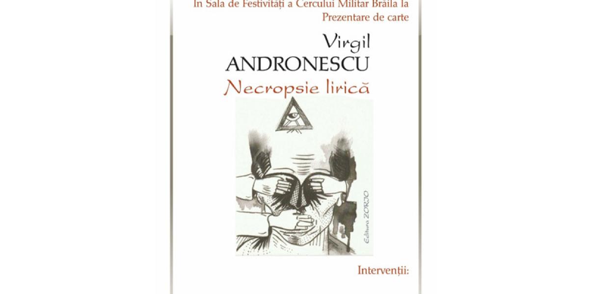 Joi, 22 februarie, de la ora 13.00, în Sala de Festivităţi a Cercului Militar Brăila va avea loc prezentarea cărţii “Necropsie lirică” semnată de poetul Virgil Andronescu, volum apărut în condiţii grafice de excepţie la editura Zorio din Bucureşti. Cartea a fost lansată pe 4 decembrie 2017, la Librăria “Mihai Eminescu” din Bucureşti, fiind cel de al şaptelea volum din opera autorului, după: “Poezii”, Editura Tipoalex Teleorman, în 2003; “Ultimele luni din viaţa umbrei mele”, Editura Alfa Iaşi - 2010; “Chipul tău blând coborât din icoane, mă ţine strâns sub pleoapă”, Editura Feed Back Iaşi, în 2011; “Foaie de observaţie - Jurnalul unei conştiinţe” - în 2011; “După Dumnezeu, potopul!”, Editura PIM Iaşi - 2014;”Cronica potopului de după Dumnezeu” - editura Zorio Bucureşti - 2014.