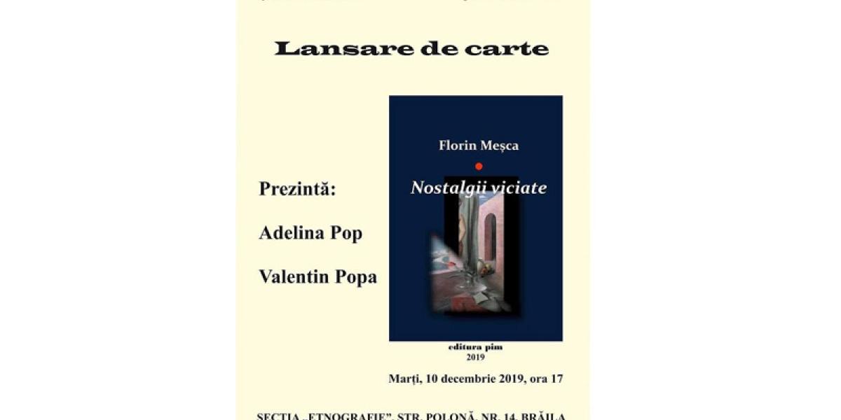 Astăzi, 10 decembrie 2019, de la ora 17.00, la Secţia “Etnografie” a Muzeului Brăilei “Carol I”, cu sediul în strada Polonă, nr. 14, are loc lansarea cărţii “Nostalgii viciate”, de Florin Meşca, apărută la Editura Pim din Iaşi anul acesta.